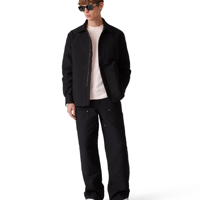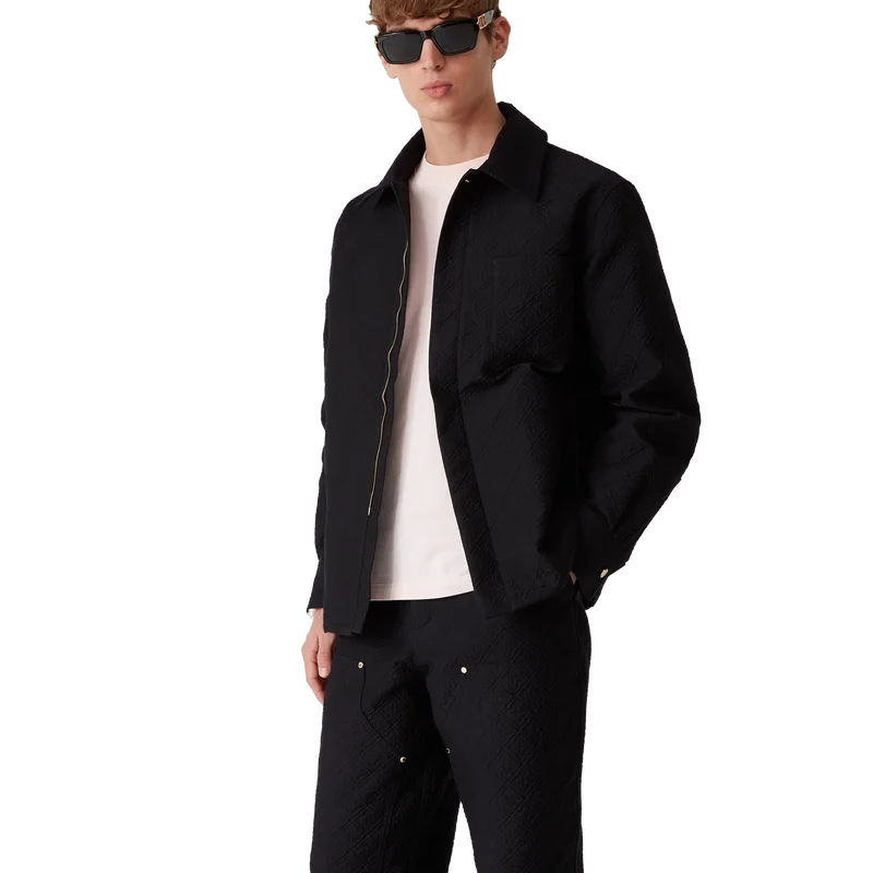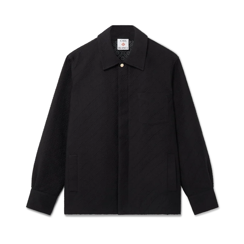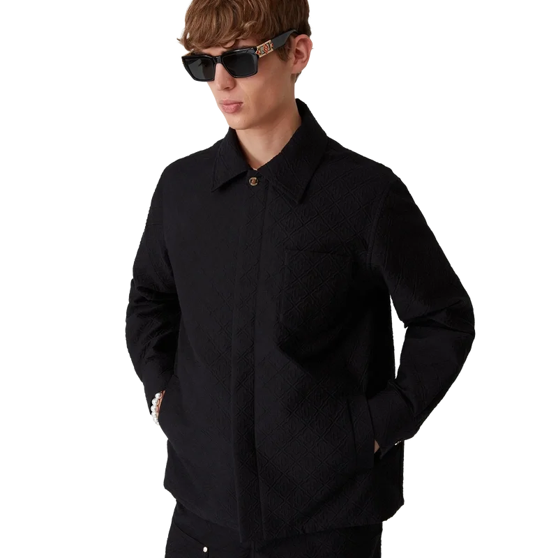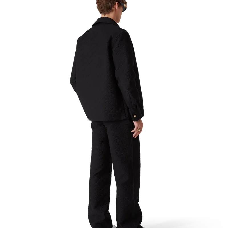 Die Jacquard-Shacket ist ein langärmeliges Modell aus einem Jacquard-Mischgewebe aus Baumwolle und Polyester. Mit aufgesetzter Brusttasche, vertikalen Leistentaschen vorne, spitzem Kragen, verdecktem Reißverschluss vorne und vergoldeten Markenknöpfen an den Ärmeln und am Kragen.