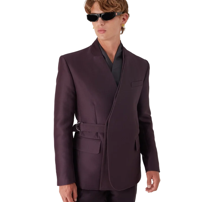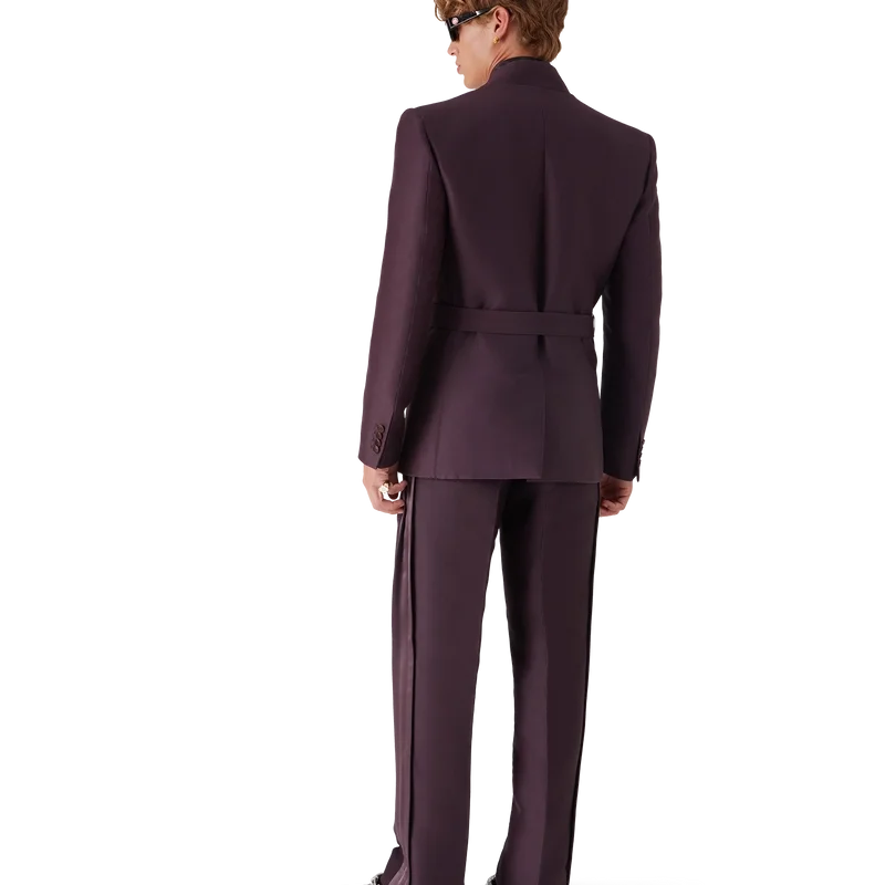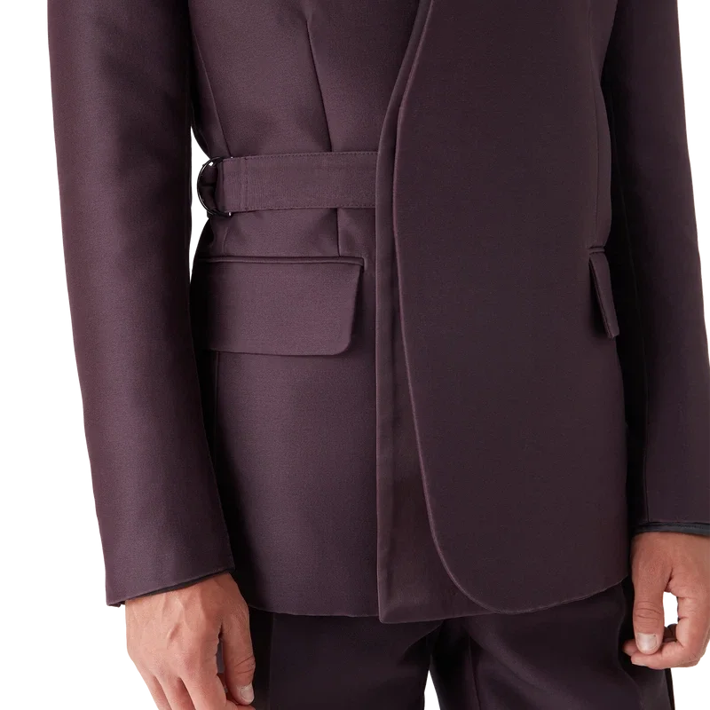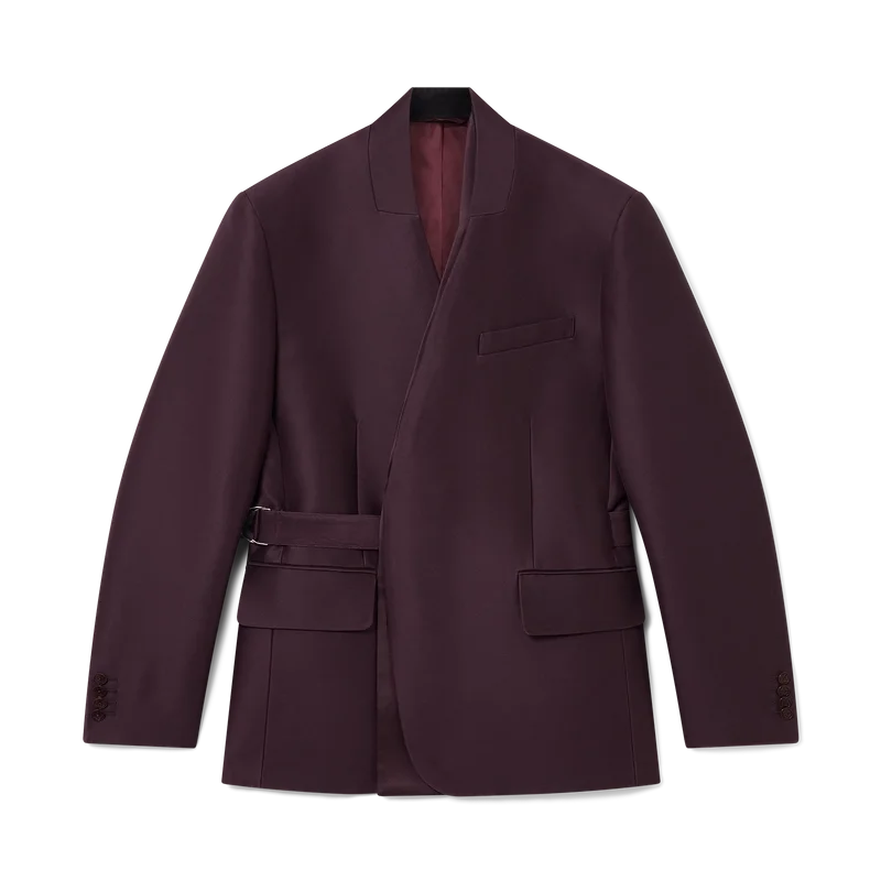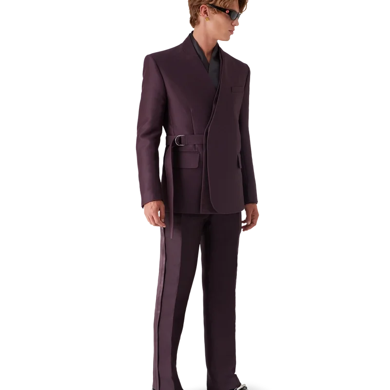 Die maßgeschneiderte Wickeljacke aus Woll-Seiden-Mischung ist ein kragenloses, langärmeliges Zweireiher-Modell aus einem maßgeschneiderten Stoff, inspiriert von der traditionellen japanischen Kimono-Kleidung, mit besonderem Fokus auf Wickel- und Überkreuz-Ausschnitte. Abgerundet durch einen Gürtelverschluss, Pattentaschen und ein ineinander verschlungenes CC-Logo an den Manschetten.