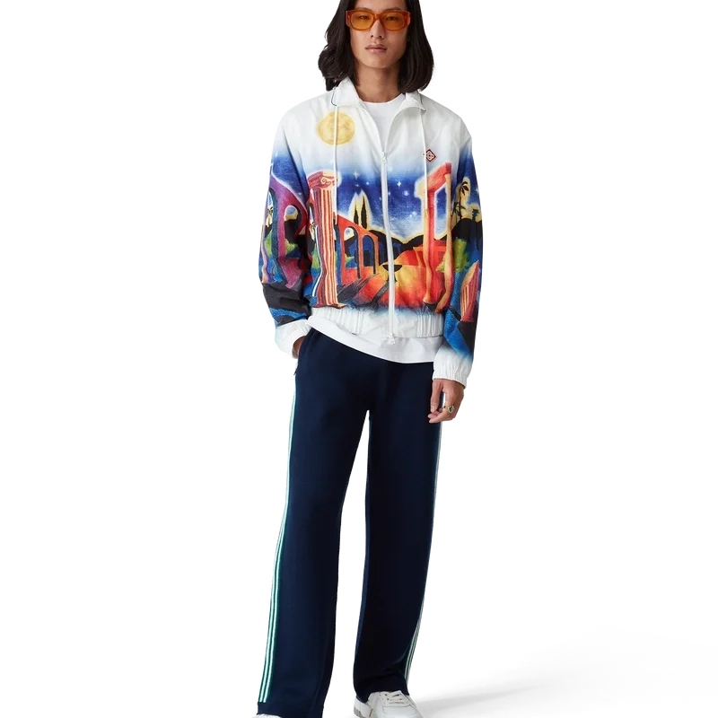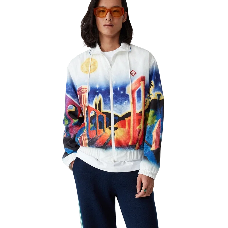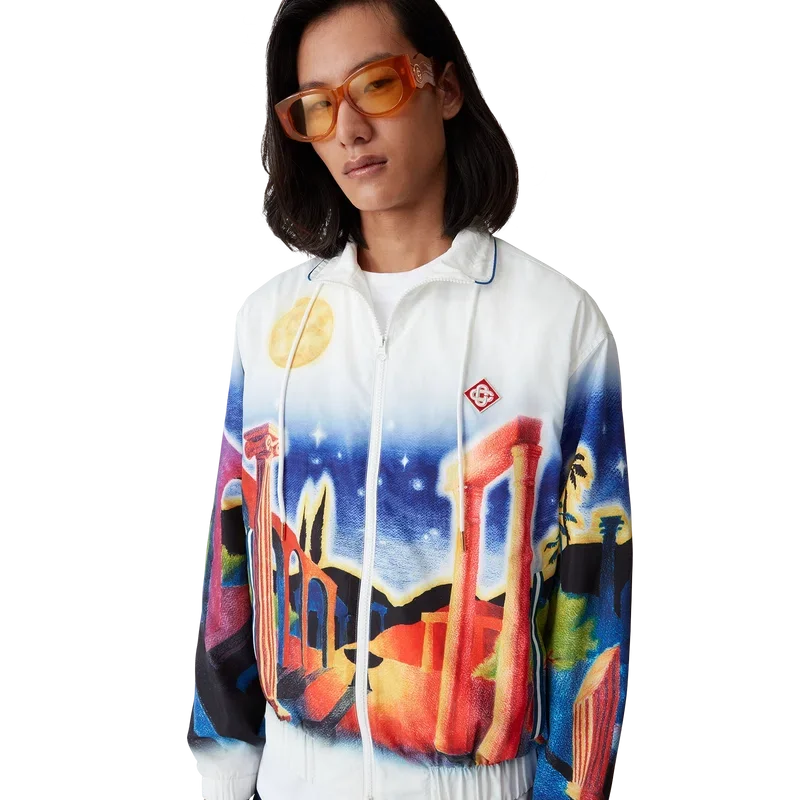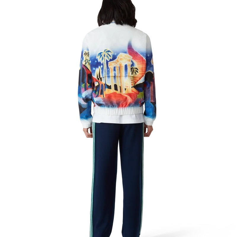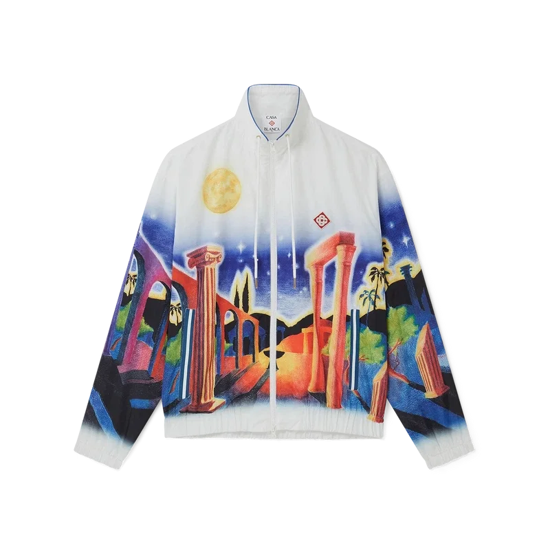 Die Midnight Acropolis Windbreaker-Jacke ist ein klassisches Design mit dem saisonalen Kunstwerk des Hauses, das der wunderschönen Nacht des antiken Griechenlands mit dem schönen Licht des Tempels und des Himmels huldigt. Sie ist aus einem Poly-Taft-Stoff gefertigt. Ausgestattet mit einem Stehkragen mit blauer Paspelierung und goldfarbenen Kordelzügen, einem Reißverschluss vorne, vertikalen Reißverschlusstaschen mit Streifenmuster, einem Regenschutz mit Mesh-Belüftungsstreifen, Mesh-Futter sowie elastischen Bündchen und Saum.