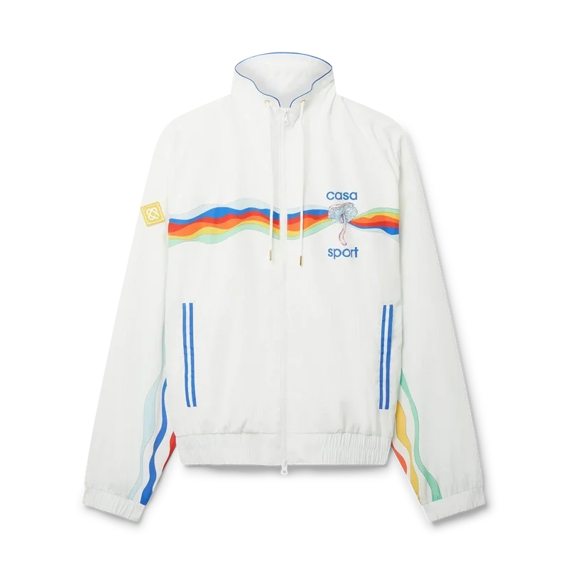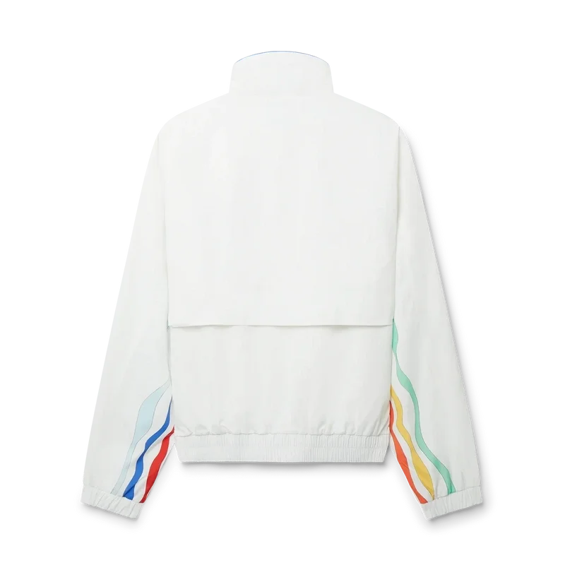 Sportlicher Luxus trifft auf Retro-Charme mit unserer weißen Mind Vibrations Wave Shell Trainingsjacke aus Polyester. Der sportliche Stil der Oberbekleidung vereint unser Mind Vibrations-Motiv, ein zentrales Thema der Frühjahr/Sommer-Kollektion 2023, mit einer klassischen Trainingsjacken-Silhouette, einem Frontreißverschluss, Seitentaschen und Kordelzügen mit goldenen Enden. Hier kombiniert mit passenden Shorts.