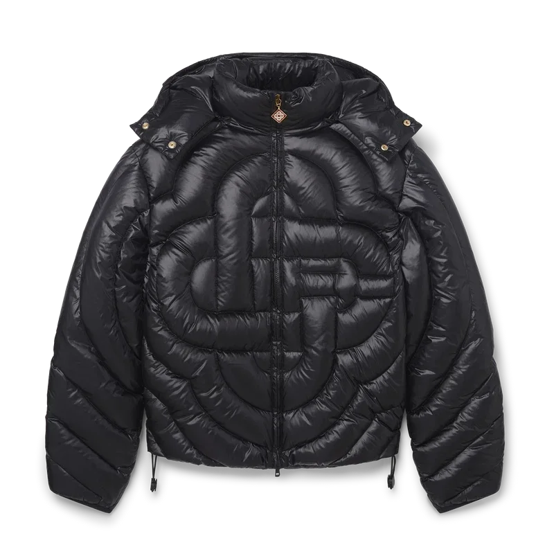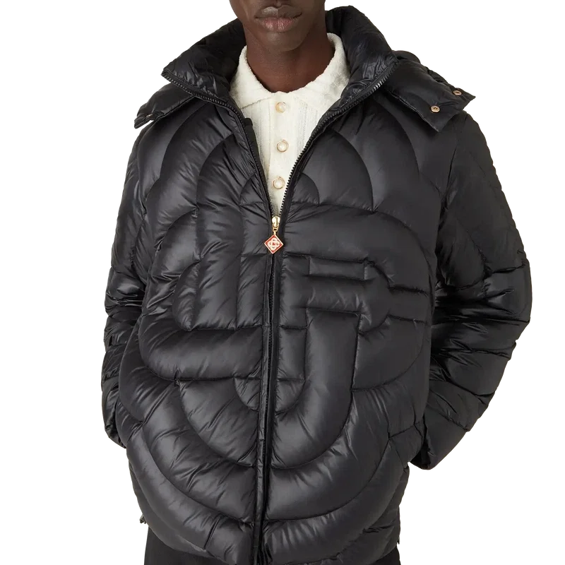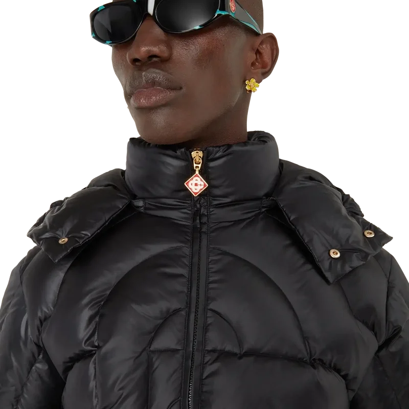 Die Monogram Quilted Nylon Pufferjacke ist ein Modell mit Kapuze, das auf der Vorder- und Rückseite mit dem charakteristischen Diamond Monogram des Hauses verziert ist und aus einem gesteppten Stoff gefertigt ist. Ausgestattet mit einer abnehmbaren Kapuze, einem Reißverschluss mit charakteristischer Reißverschlusslasche mit Diamant-Logo, seitlichen Eingrifftaschen, einer Ärmeltasche, elastischen, verstellbaren Laschen am Saum und an der Kapuze mit ineinandergreifenden Cc-Logo-Knoöpfen sowie Manschetten mit Casablanca-Markenband.