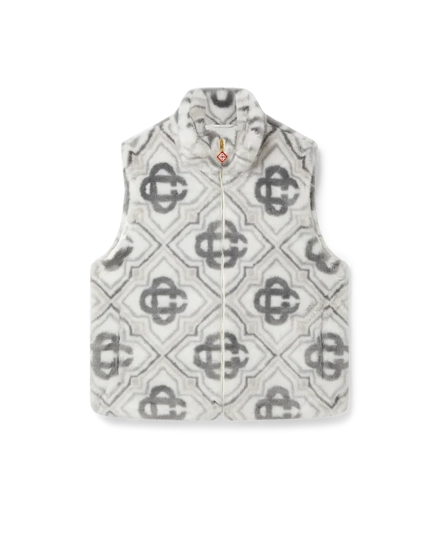 Die Monogram-Weste aus Kunstfell ist ein luxuriöses, weiches, strukturiertes Design ohne Ärmel, gefertigt aus Jacquard-Kunstfellstoff mit dem Diamond Monogram-Logo des Hauses. Mit Reißverschluss vorne, vertikalen Leistentaschen an den Seiten, einem Futter und einem Stehkragen.