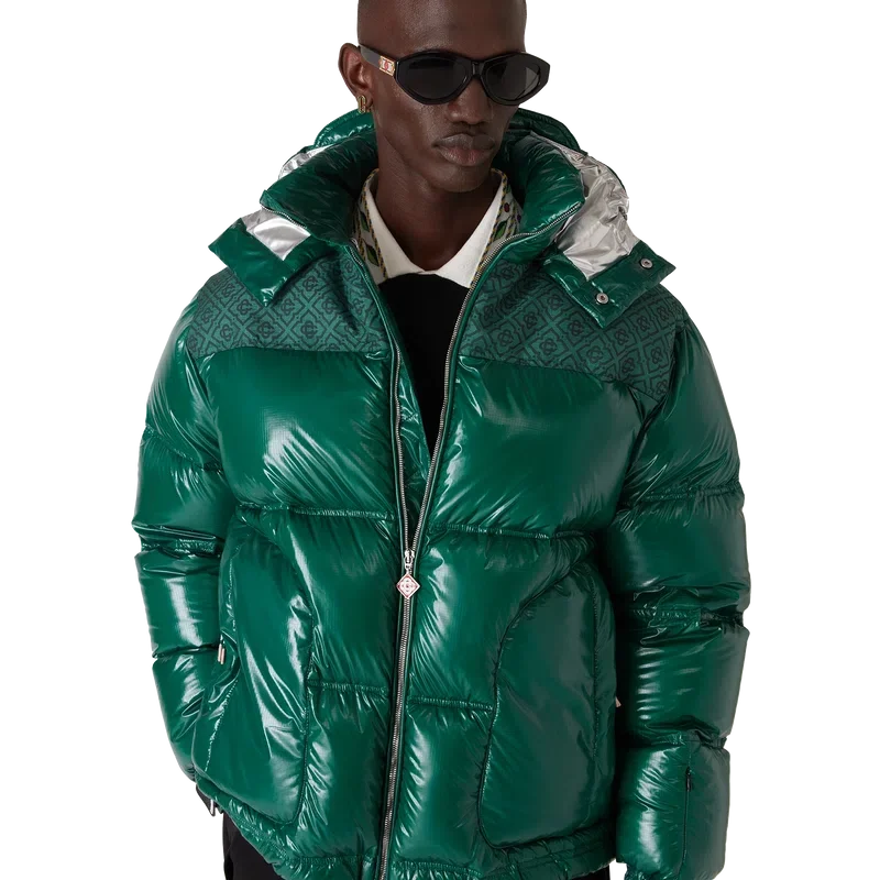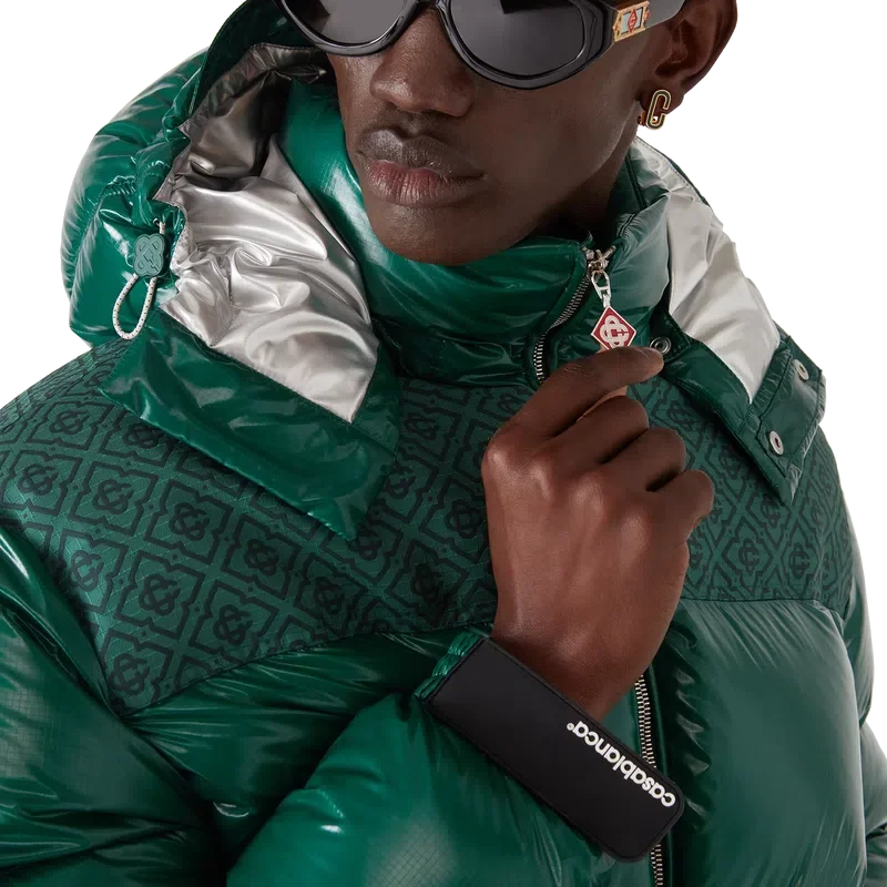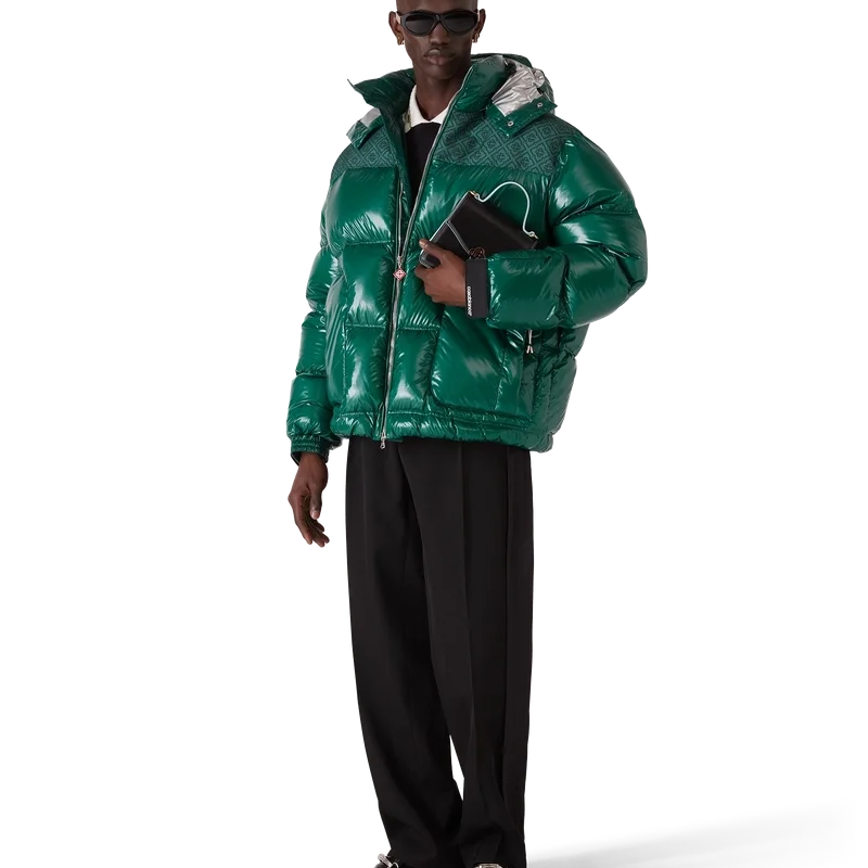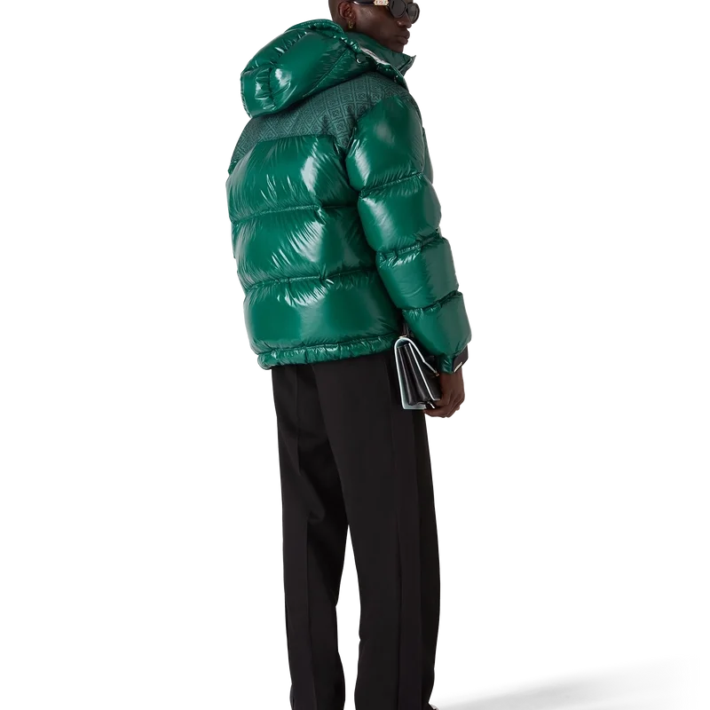 Die Nylon-Daunenjacke ist ein modernes, kastenförmiges Design der Oberbekleidung aus Ripstop-Nylon mit Daunenfüllung und kontrastierendem Monogramm-Jacquard-Einsatz über den Schultern. Abgerundet wird sie durch eine Kapuze mit Cc-Logo-Kordelstoppern und Kordelzugverschluss, einen Stehkragen für zusätzliche Wärme und Schutz vor den Elementen, einen Reißverschluss mit dem charakteristischen Diamant-Logo-Reißverschlusszug des Hauses, Fronttaschen mit Reißverschluss, verstellbare Manschettenbänder mit Markenlogo sowie einen elastischen Saum und elastische Manschetten.
