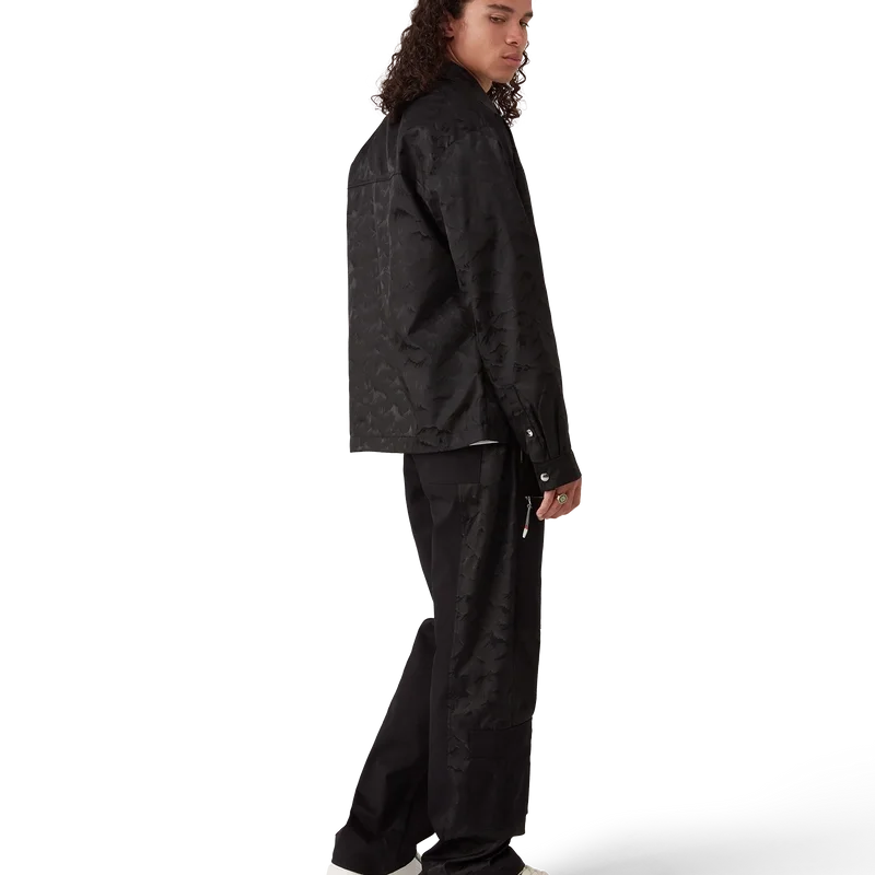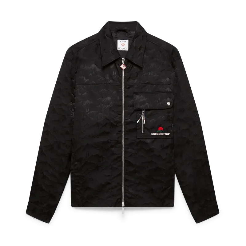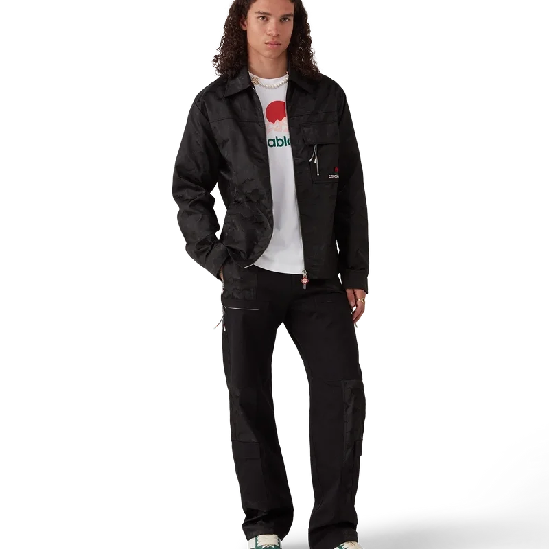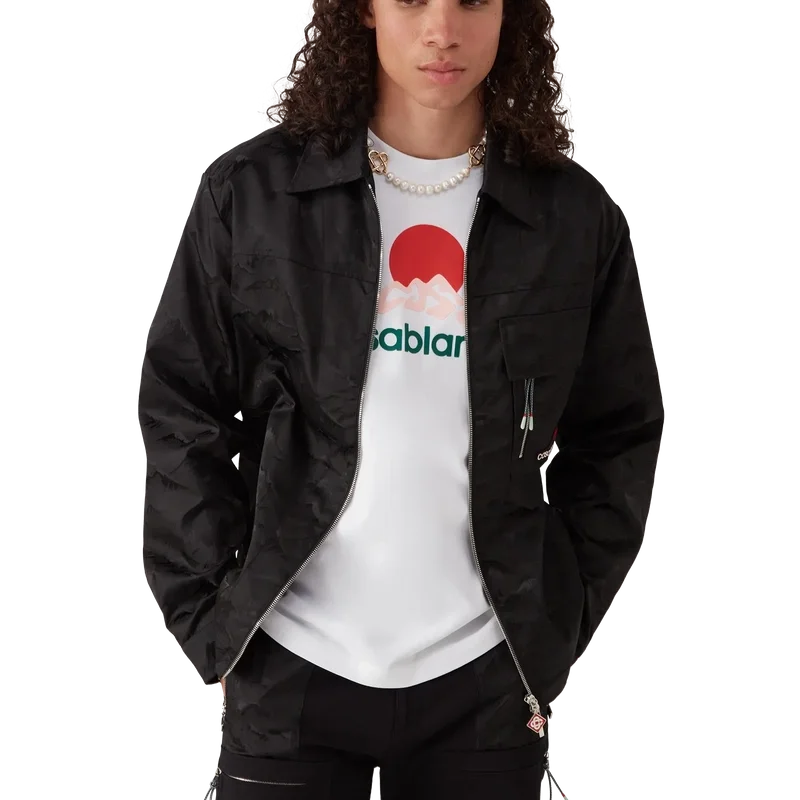 Das Nylon Mountain Camo Zip Hemd ist ein Langarm-Modell aus Jacquard-Stoff mit dem charakteristischen Rautenlogo des Hauses. Es verfügt über einen spitzen Kragen, einen Reißverschluss mit dem charakteristischen Diamant-Logo des Hauses als Reißverschlusslasche, eine Brusttasche mit Klappe und vertikalem Reißverschluss sowie die in dieser Saison von Bergsteigerseilen inspirierten Zugschnüre, Marken-Metallteile an den Ärmelbündchen und der Tasche sowie das „Casa Montagne“-Textlogo des Hauses – ein Logo, das auf den ersten Blick wie ein Berg aussieht, bei genauerem Hinsehen jedoch „Casa“ zu lesen ist.