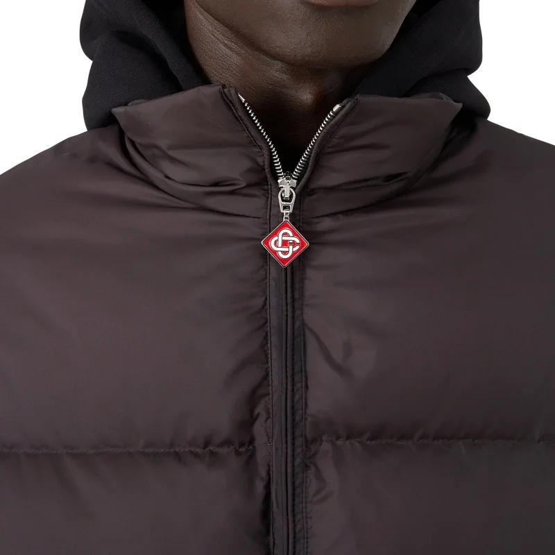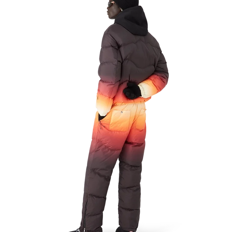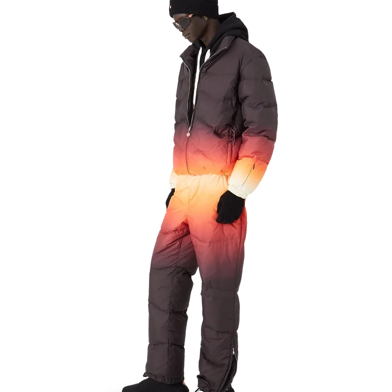 Die Ski-Pufferjacke ist ein raffiniertes Design der Oberbekleidung aus gradientenbedrucktem, gestepptem Daunenstoff mit einem mehrfarbigen Farbverlauf, inspiriert von dramatischen Sonnenuntergängen über Japans schneebedeckten Bergketten. Sie greift atemberaubende Momente auf, in denen sich der Himmel über ländlichen Winterlandschaften in leuchtende Farben verwandelt. Abgerundet durch einen Reißverschluss mit dem charakteristischen Diamant-Logo-Reißverschlusszug des Hauses, Fronttaschen mit Reißverschluss, eine Skipass-Tasche am linken Ärmel sowie einen elastischen Saum und elastische Bündchen.
