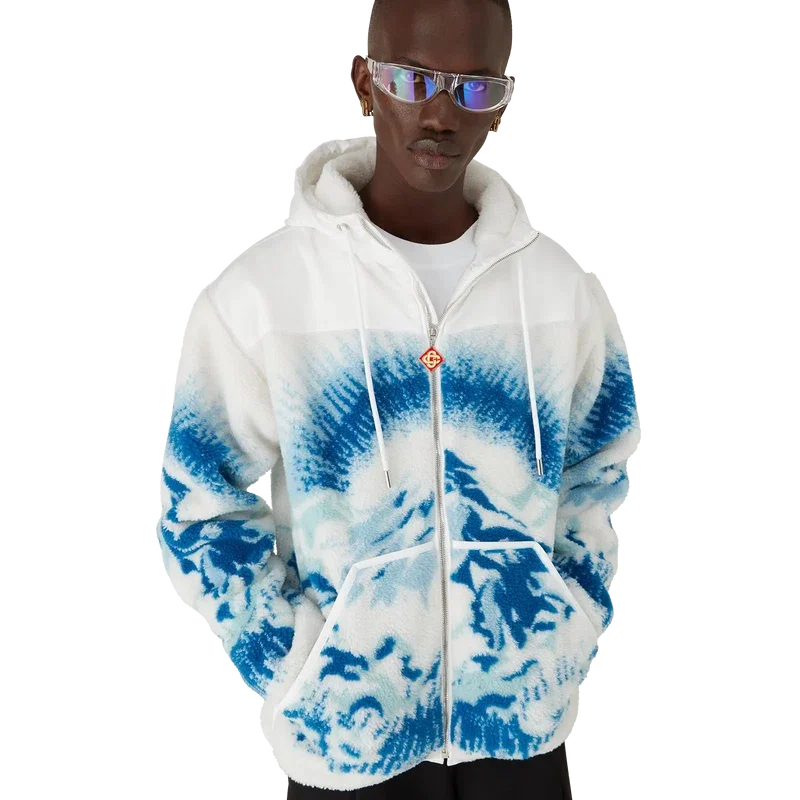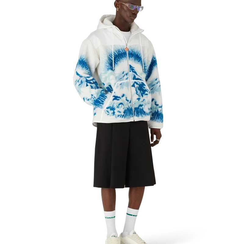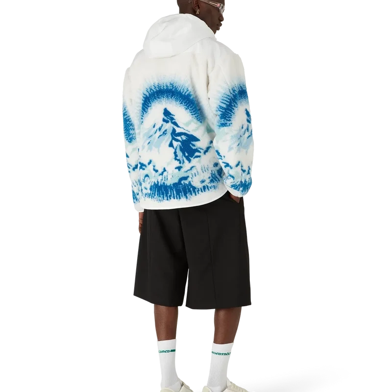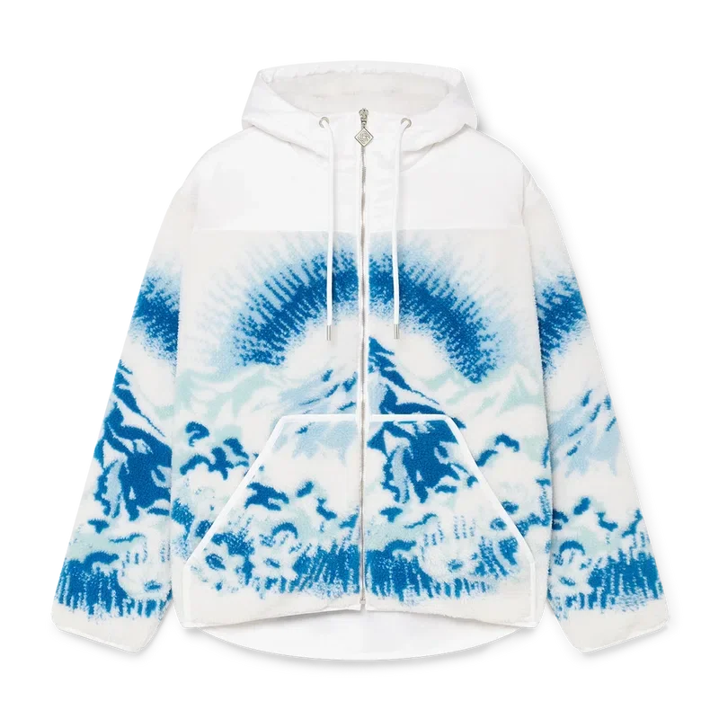 Die Ski-Jacke ist ein raffiniertes Design der Oberbekleidung aus weißem, recyceltem Polyester-Fleece, inspiriert vom monolithischen Gipfel des Berges. Wie geschliffener Kristall, der den sanften, blau schimmernden Farbverlauf des klaren Morgenhimmels durchbricht, strahlt das Design alpine Eleganz aus. Abgerundet durch ein Viskosefutter und eine Silhouette mit lockerer Passform.