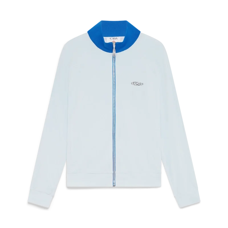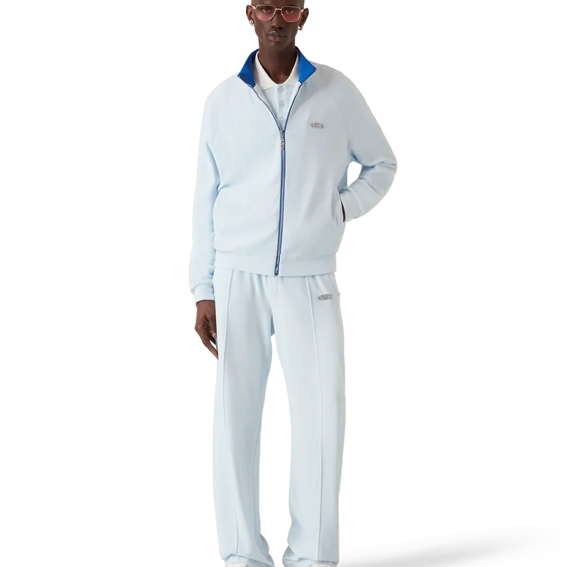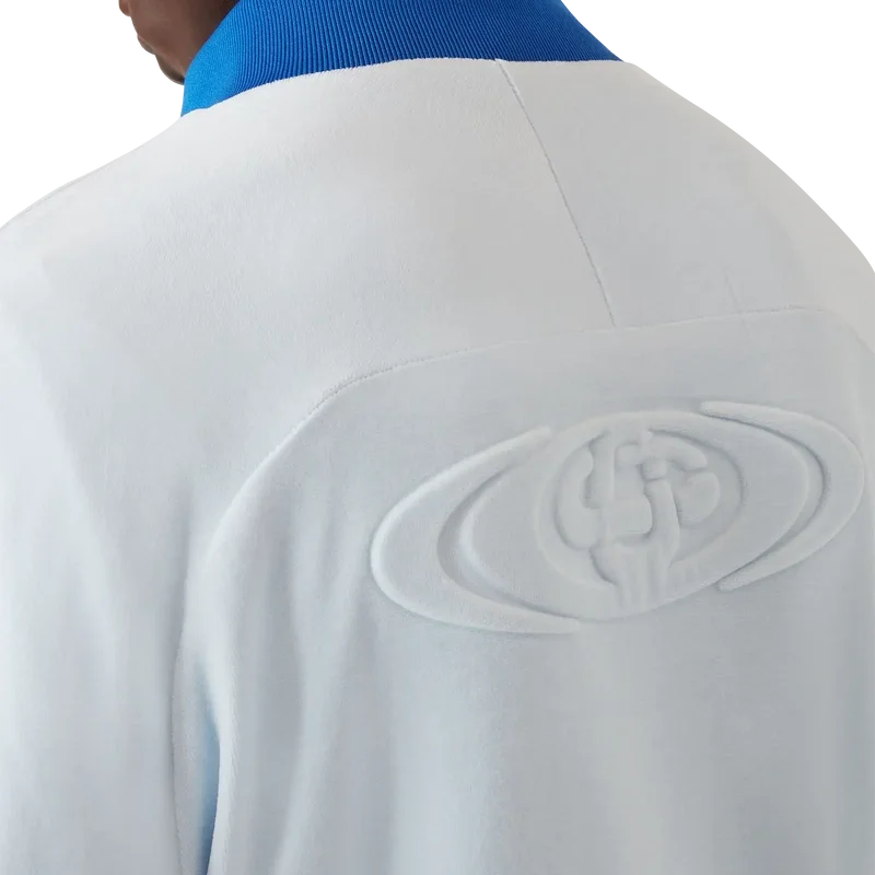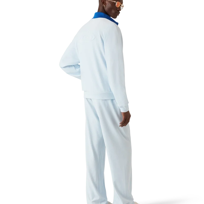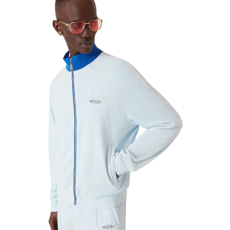 Die Velours-Trainingsjacke ist ein langärmeliges Sportbekleidungsmodell mit dem Warped-Logo des Hauses. Sie verfügt über einen Reißverschluss mit charakteristischer Reißverschlusslasche mit Diamant-Logo, Paspeldetails vom Kragen bis zu den Achseln, vertikale Leistentaschen sowie einen hohen Kragen, Ärmelbündchen und Saum aus Rippstrick.