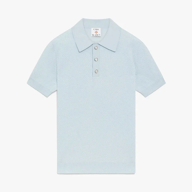 Das blaue Pointelle-Monogramm-Poloshirt mit kurzen Ärmeln ist ein raffiniertes Strickdesign mit einer offenen Pointelle-Struktur und dem charakteristischen Monogramm-Muster des Hauses. Abgerundet wird es durch einen gerippten Kragen und eine gerippte Knopfleiste, einen Knopfverschluss, charakteristische goldene Perlenknöpfe sowie gerippte Manschetten und einen gerippten Saum.