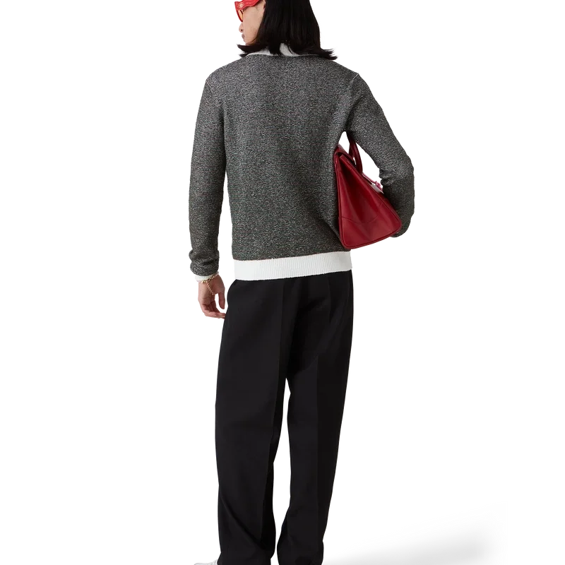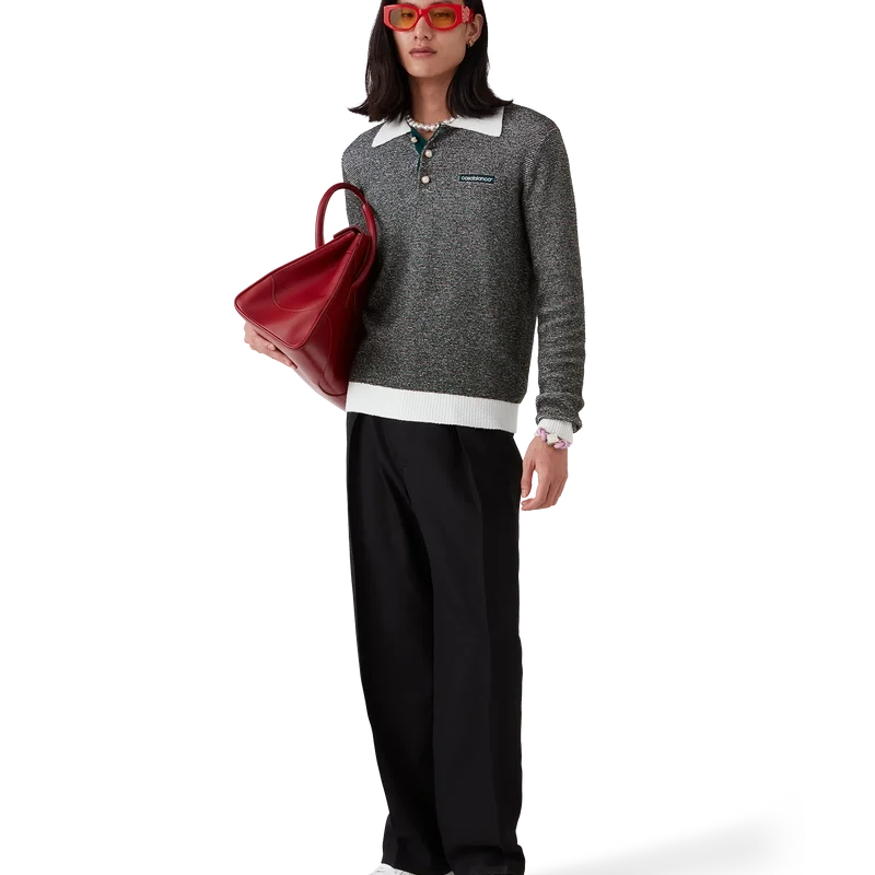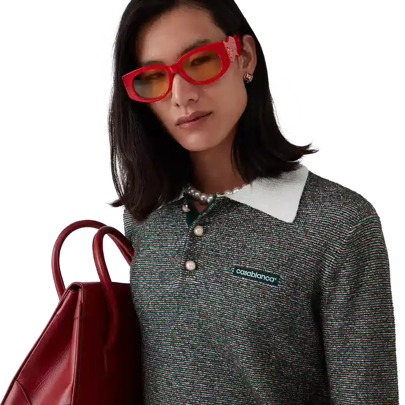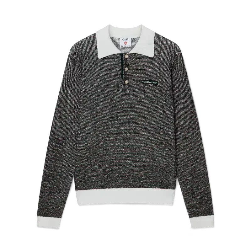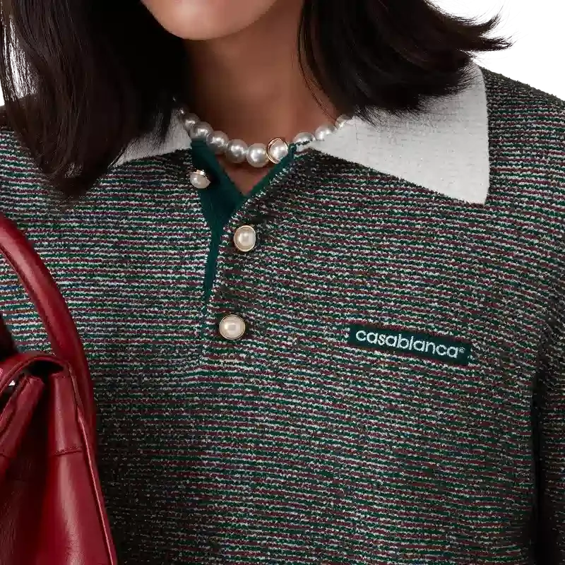 Das Bouclé-Streifen-Poloshirt ist ein Langarm-Modell aus Bouclé-Streifenstoff mit dem „Casablanca“-Logo des Hauses. Abgerundet wird es durch eine Knopfleiste mit drei Knöpfen, charakteristische goldgeränderte Perlmuttknöpfe sowie kontrastierende Rippbündchen an Knopfleiste, Saum, Ärmelbündchen und Kragen.