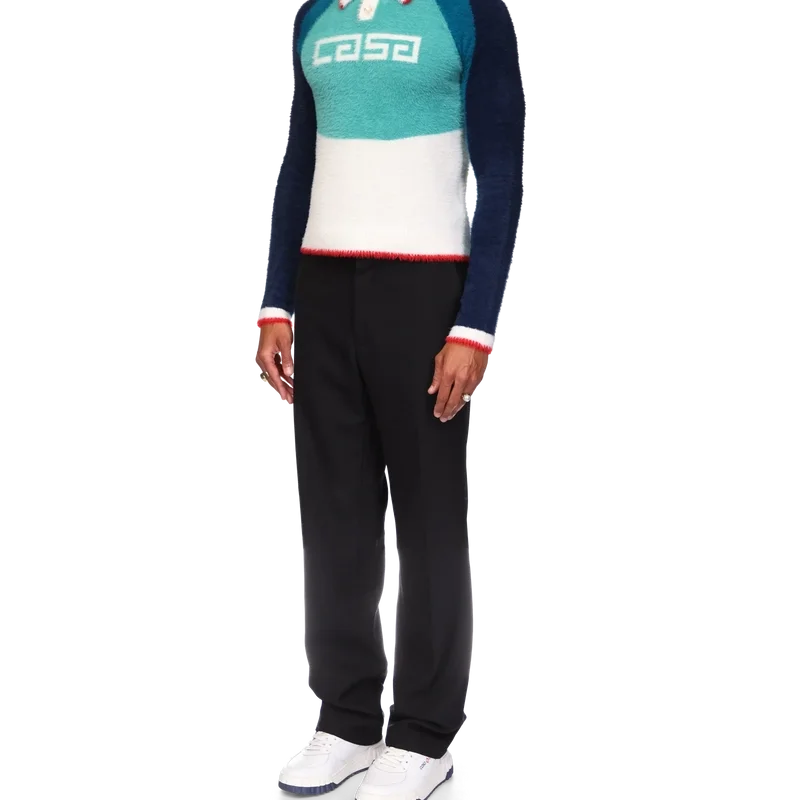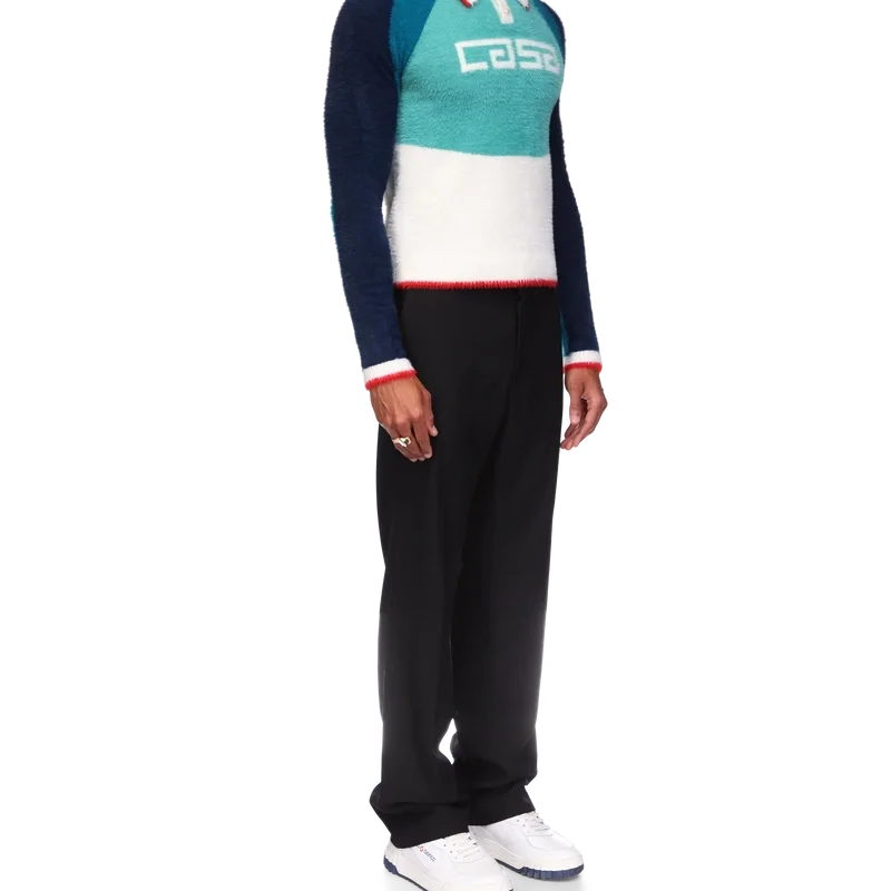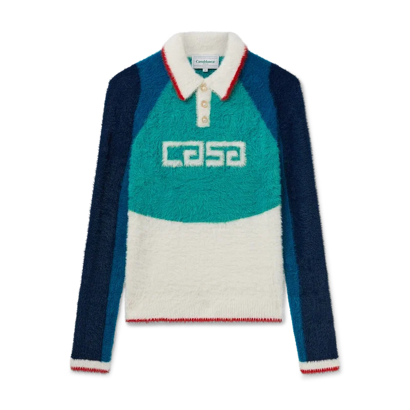 Das Casa Sport Fluffy Polo Shirt ist ein langärmeliges Modell aus flauschigem Strickstoff. Mit den charakteristischen, goldumrandeten Perlknöpfen des Hauses, einem gerippten Kragen, Manschetten und Saum mit kontrastierenden Kanten sowie dem Schriftzug „Casa“ auf der Brust im griechisch inspirierten Greek-Key-Stil.