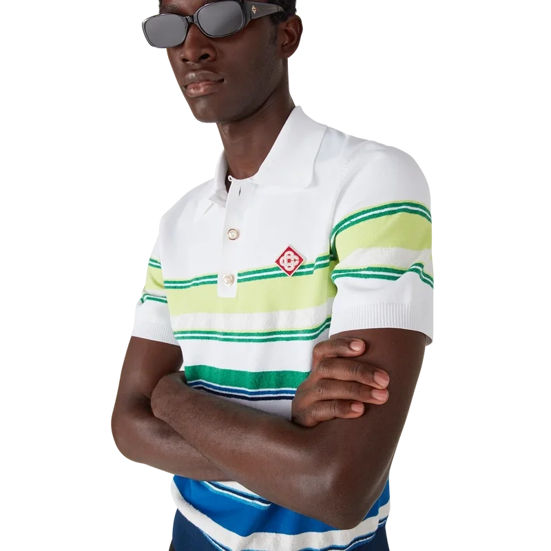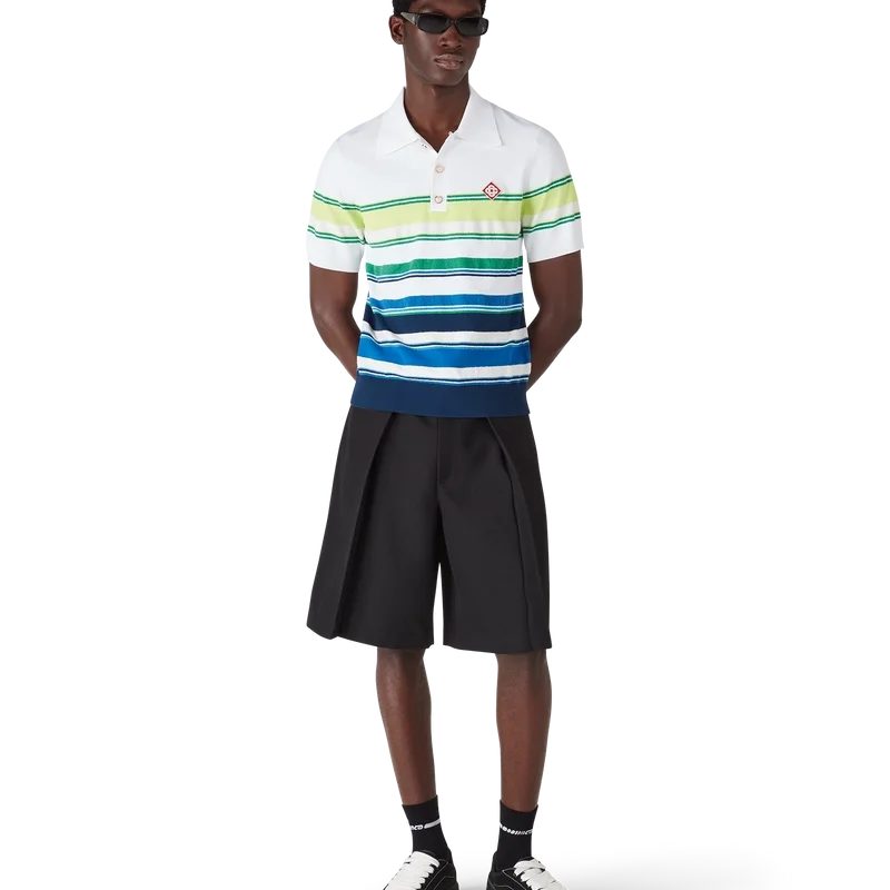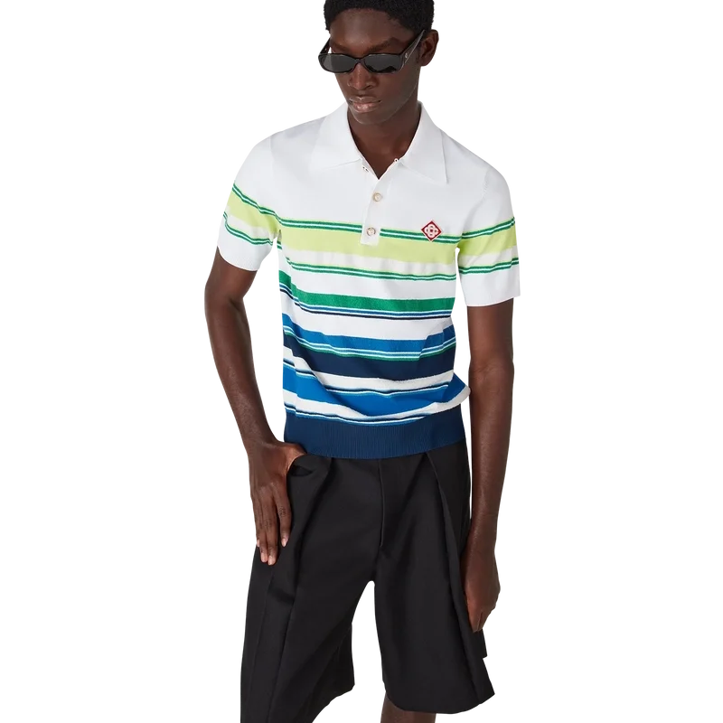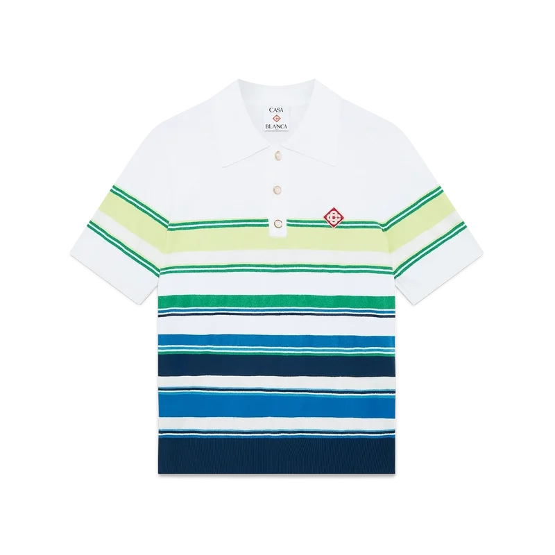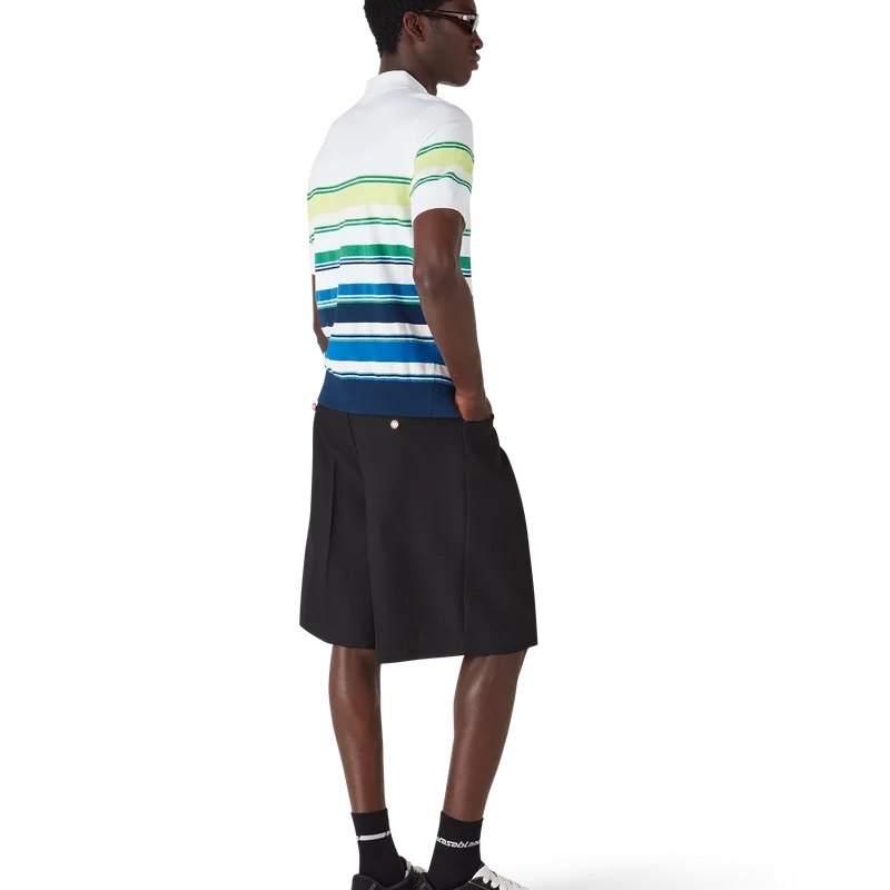 Das Poloshirt mit Farbverlaufsstreifen ist ein raffiniertes Strickdesign aus Viskose mit dem charakteristischen Diamant-Logo des Hauses. Abgerundet durch einen gerippten Kragen, Ärmelbündchen, Saum und Knopfleiste, Streifenverzierungen am gesamten Oberteil sowie eine klassische Knopfleiste mit drei Knöpfen und charakteristischen goldenen Perlenknöpfen.