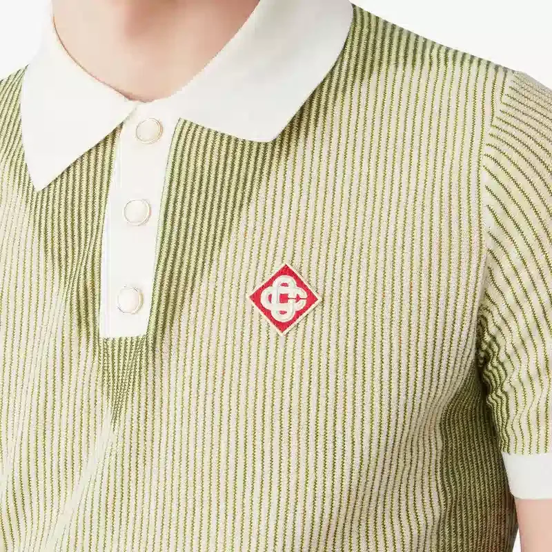 Das kurzärmelige Polohemd mit vertikalen Streifen ist ein raffiniertes Strickdesign mit einer lockeren Silhouette. Abgerundet wird es durch einen kontrastierenden Kragen und eine Knopfleiste, einen Knopfverschluss, die charakteristischen goldgeränderten Perlmuttknöpfe, gerippte Bündchen und Saumdetails sowie das Warped-Logo des Hauses auf den Ärmeln.
