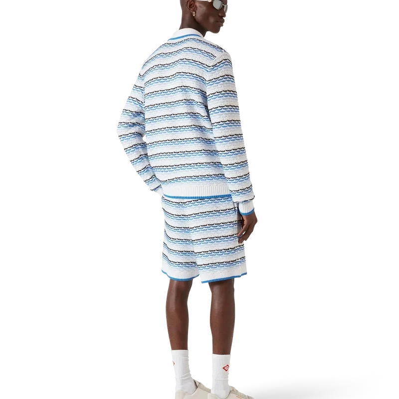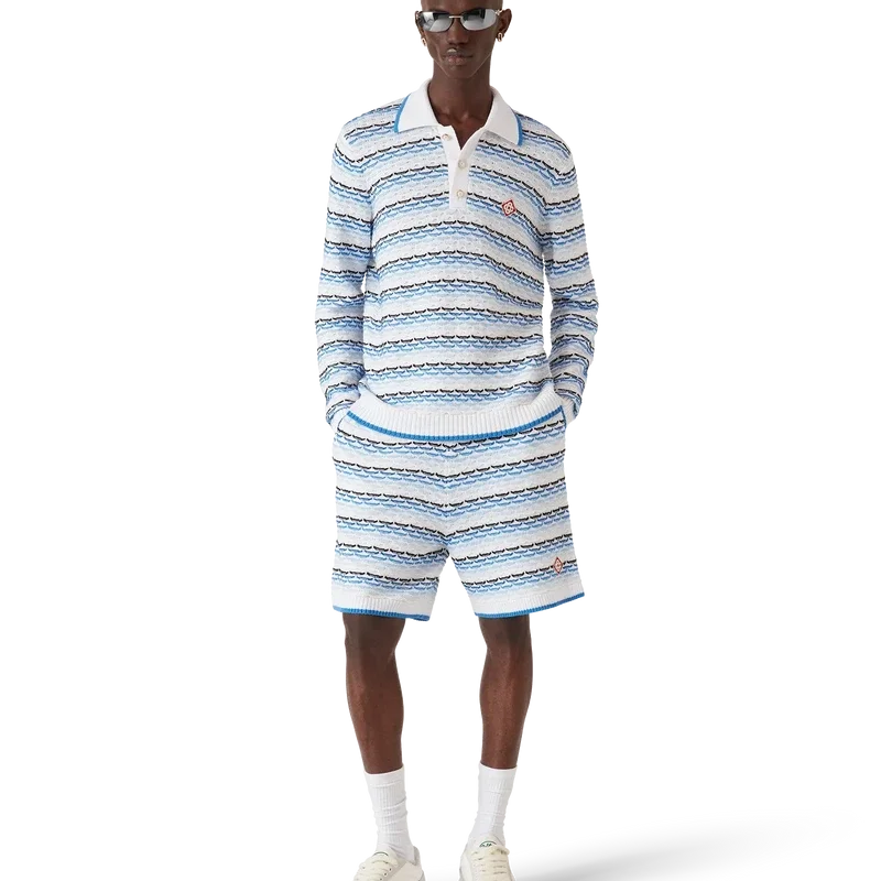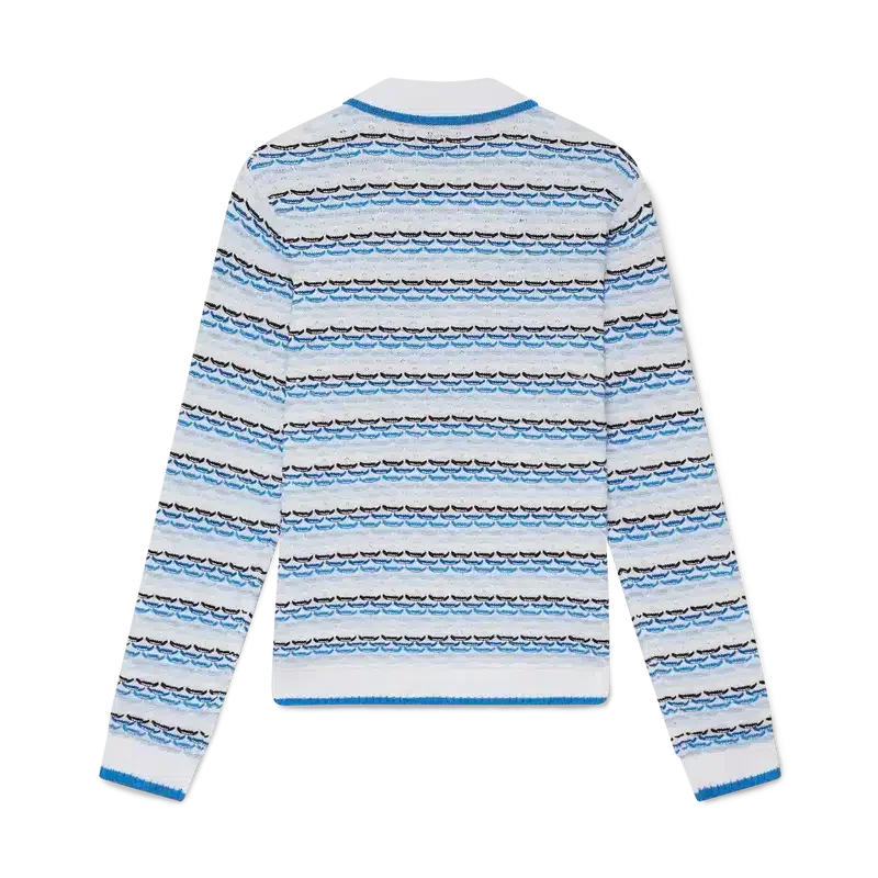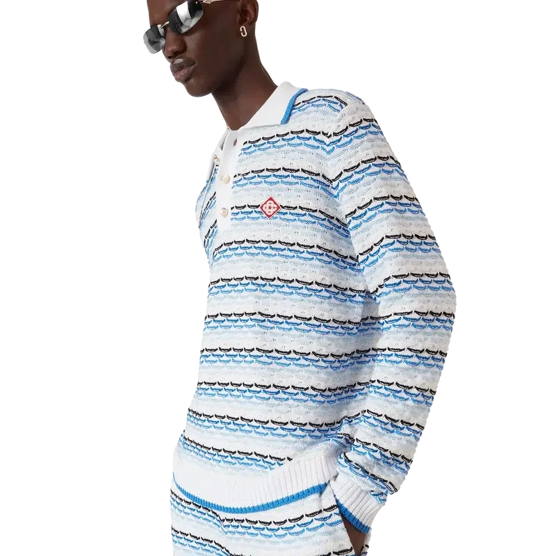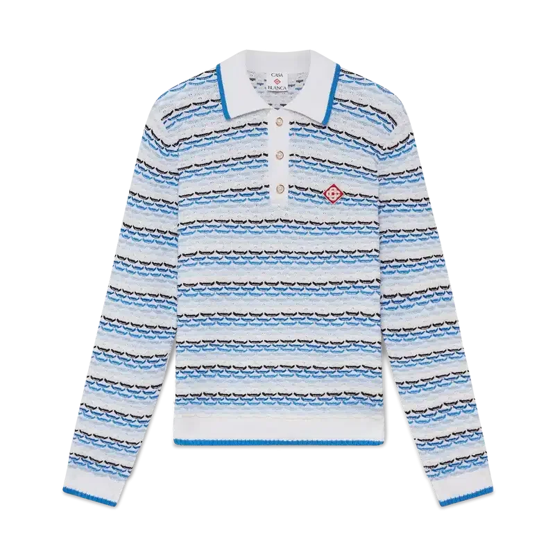 Das Tuck-Stitch-Langarm-Poloshirt ist ein Strickmodell mit dem charakteristischen Diamant-Logo des Hauses. Mit Knopfleiste, charakteristischen goldenen Perlenknöpfen und geripptem Kragen, Manschetten und Saum mit Kantenverzierung.