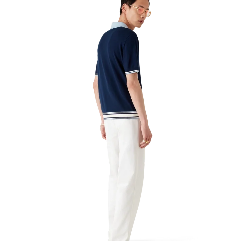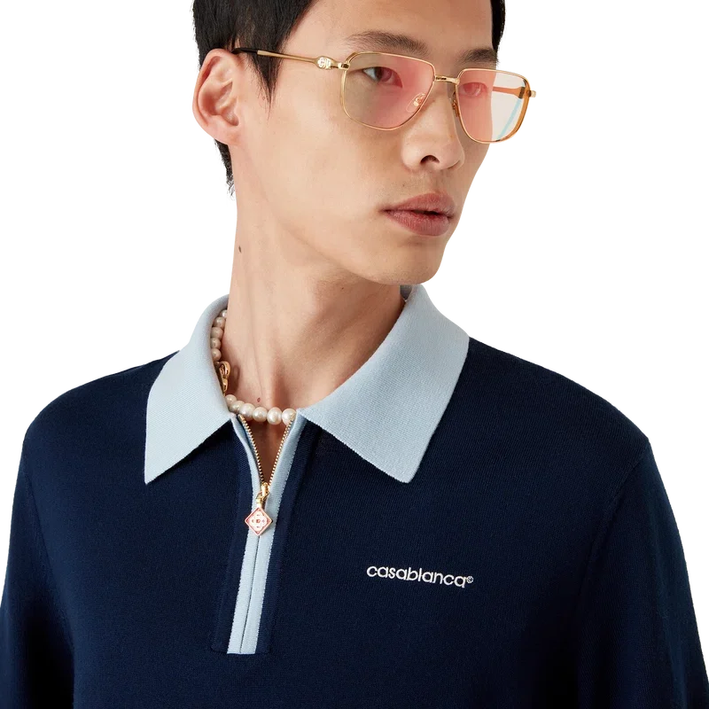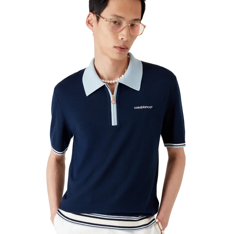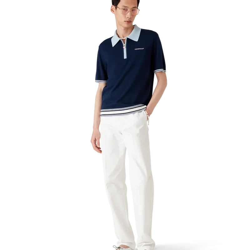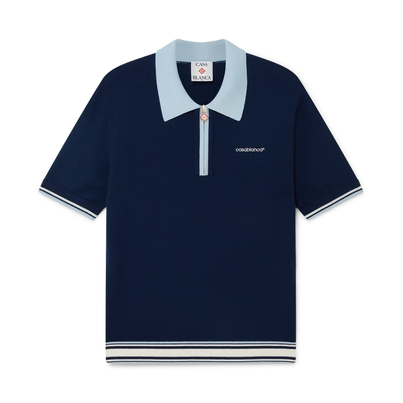 Das Merino-Tennis-Shorts-Polohemd mit kurzen Ärmeln ist ein Strickmodell aus Merinowolle. Es verfügt über einen Reißverschluss, einen Reißverschluss-Zipper mit dem charakteristischen Diamant-Logo, gestreifte Details an Saum und Ärmelbündchen, einen kontrastierenden gerippten Kragen und eine Knopfleiste sowie das Casablanca-Logo des Hauses.