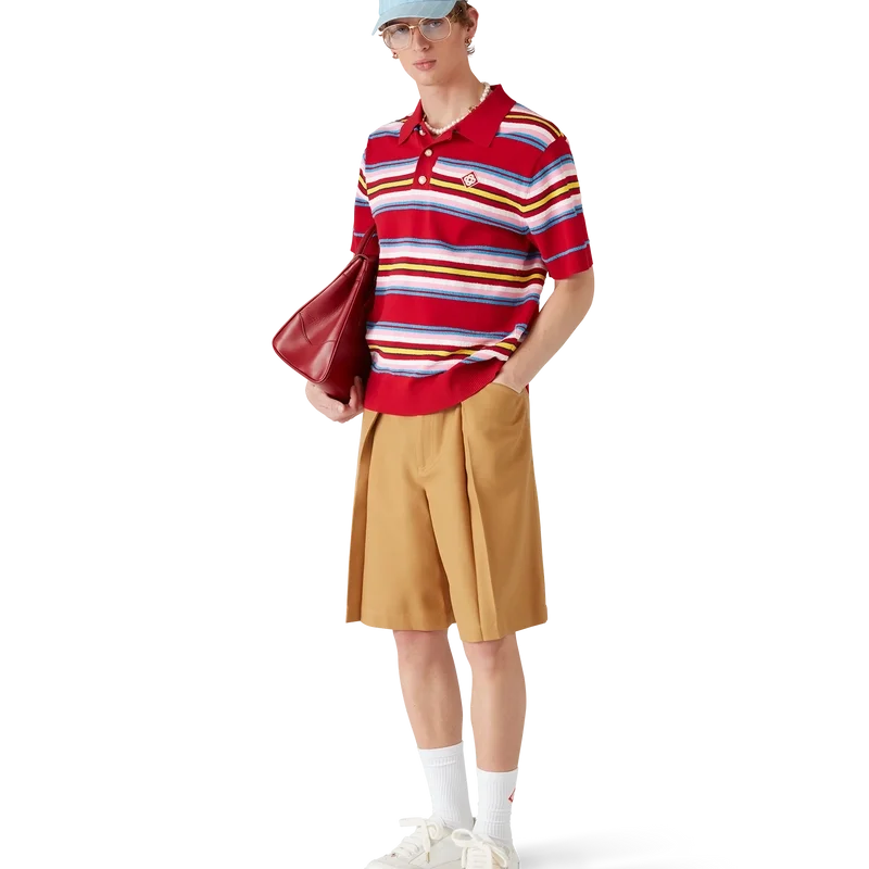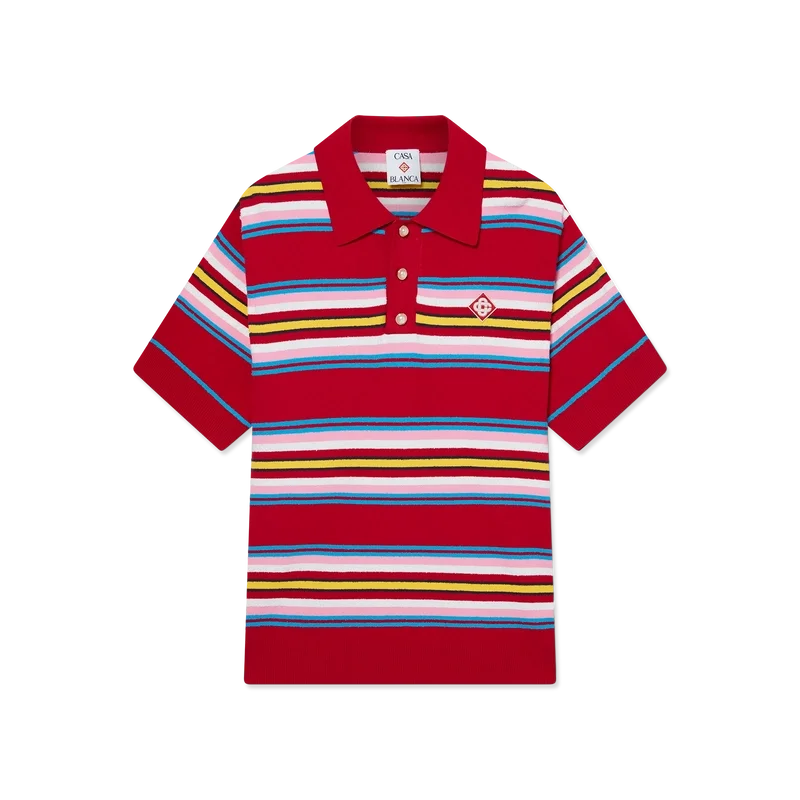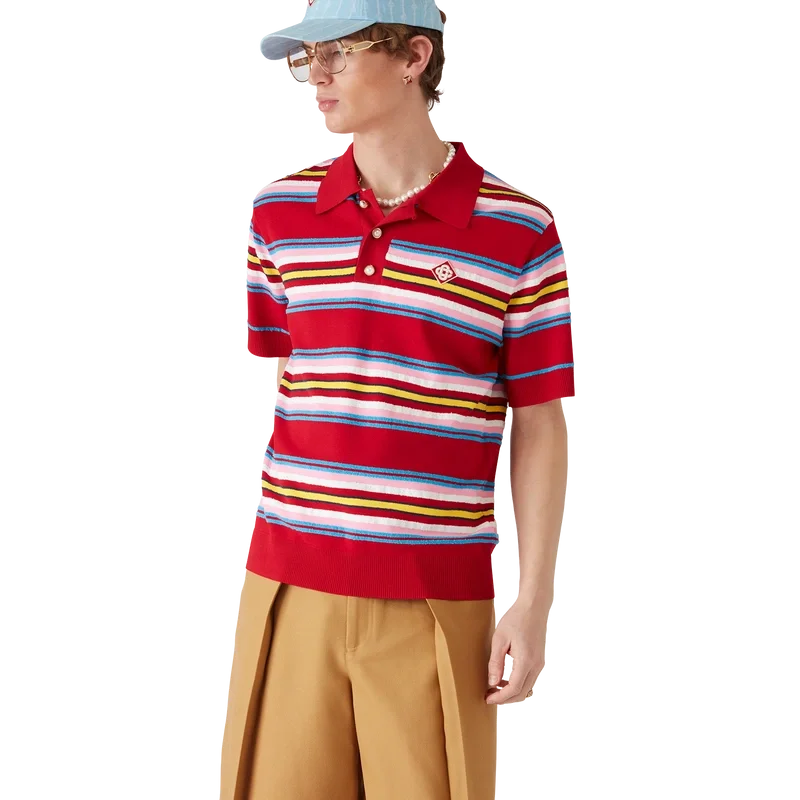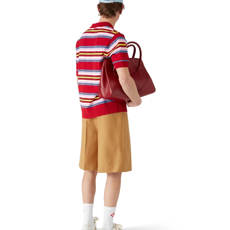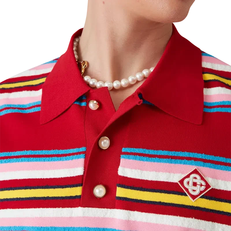 Das gestreifte Oversize-Poloshirt ist ein kurzärmeliges Modell aus gestreiftem Strickstoff mit dem charakteristischen Rautenlogo des Hauses. Abgerundet durch die charakteristischen Perlenknöpfe mit Goldrand, eine Knopfleiste mit drei Knöpfen sowie gerippte Bündchen, Saum, Kragen und Knopfleiste.