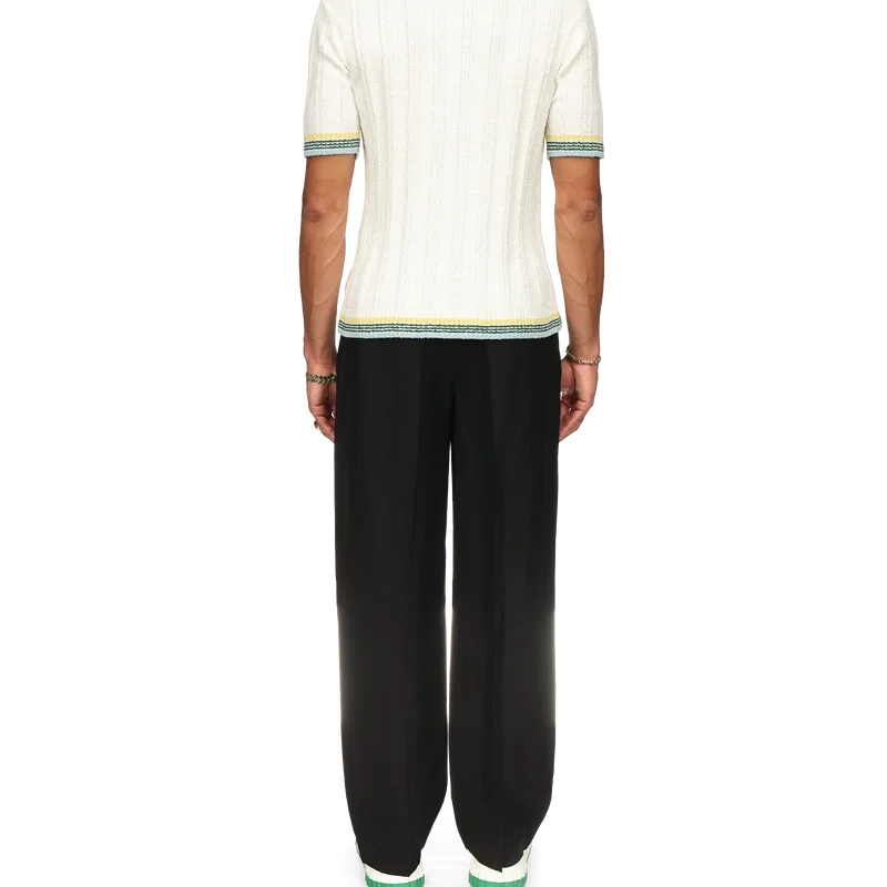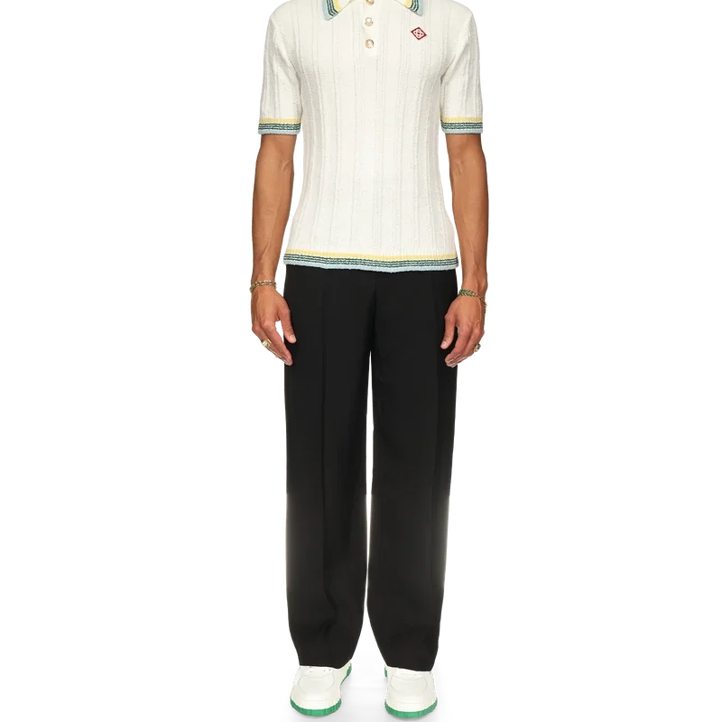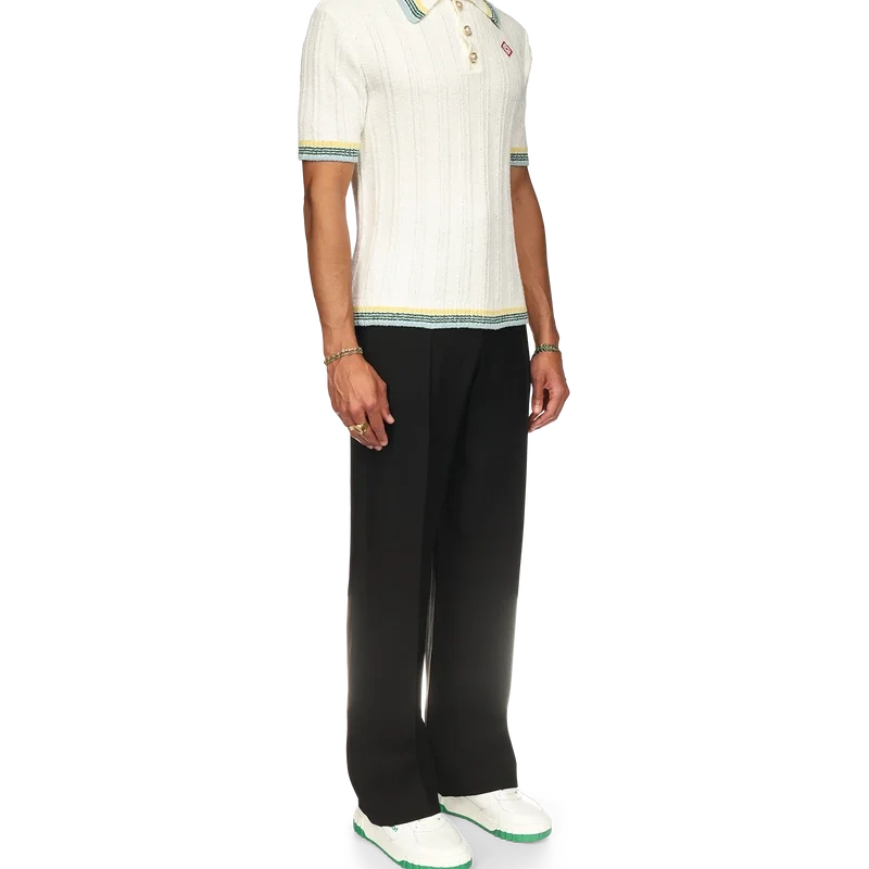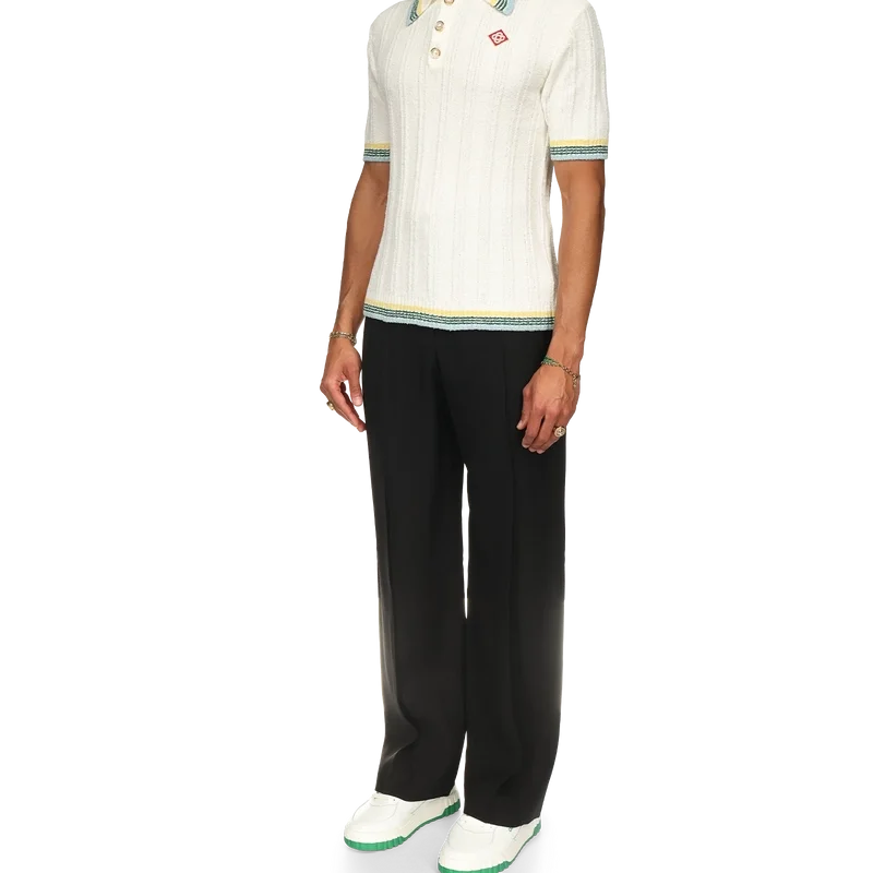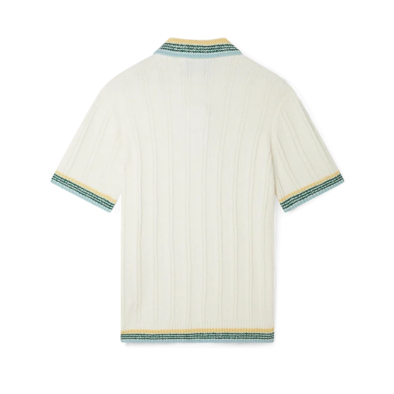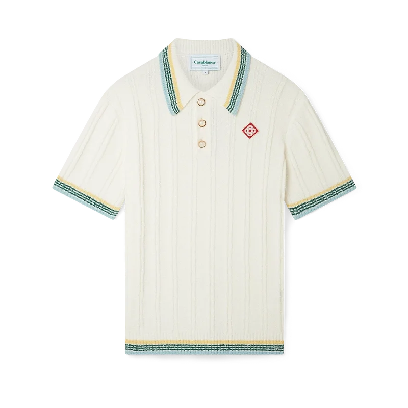 Das Poloshirt aus geripptem Bouclé-Stoff verfügt über ein rotes Rautenlogo und eine gerippte Struktur. Es ist aus einem Baumwollmischgewebe gefertigt und mit goldumrandeten Perlknöpfen, einem Casablanca-Markenlabel sowie Streifenverzierungen an Kragen, Manschetten und Saum versehen.
