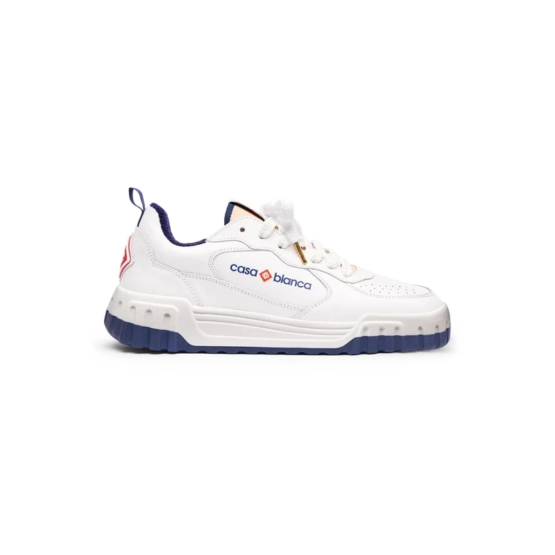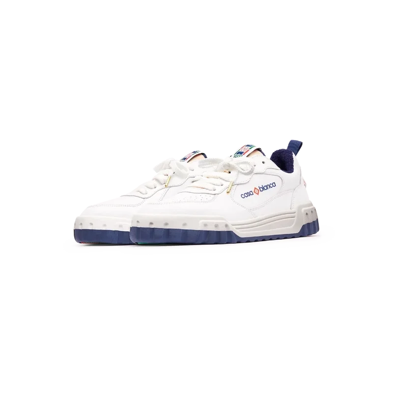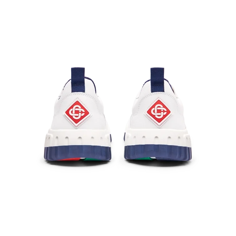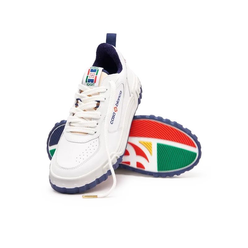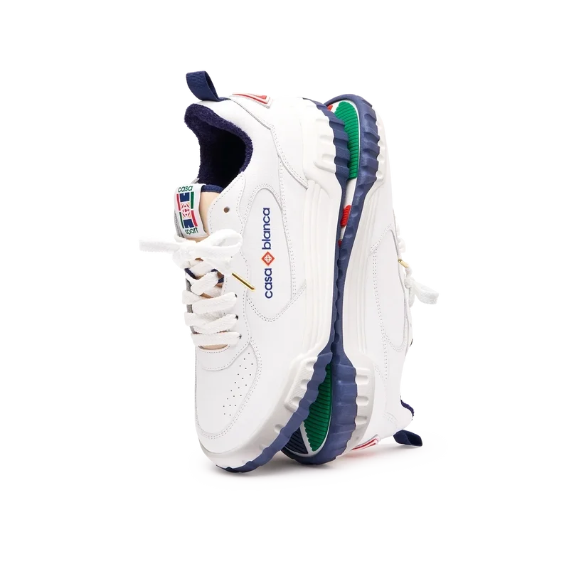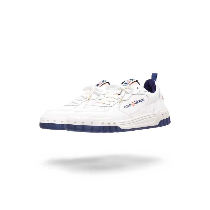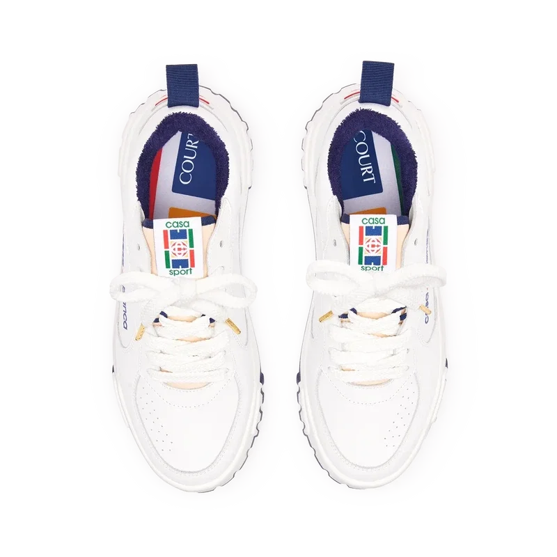 Das Obermaterial des Schuhs zeichnet sich durch integrierte, fließende Panel-Linien aus, die an die ikonischen Silhouetten der 90er Jahre anknüpfen. Das markante Casablanca-Branding ist durchgehend sichtbar, einschließlich des charakteristischen Diamantmotivs der Marke an der Ferse, des seitlichen Silikon-Wordmarks sowie des gewebten Zungenlabels und der Einlegesohle mit Tennisplatz-Motiv, die dem Schuh seinen Namen „Court“ geben.