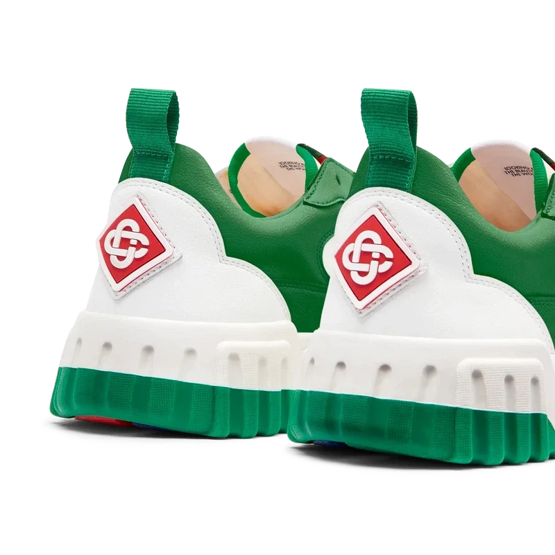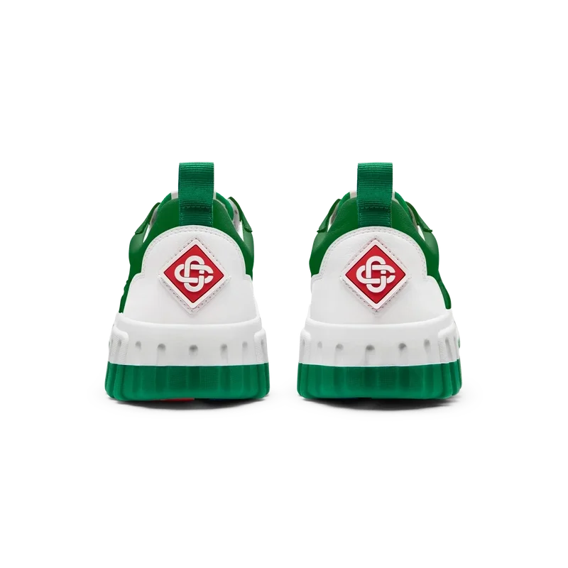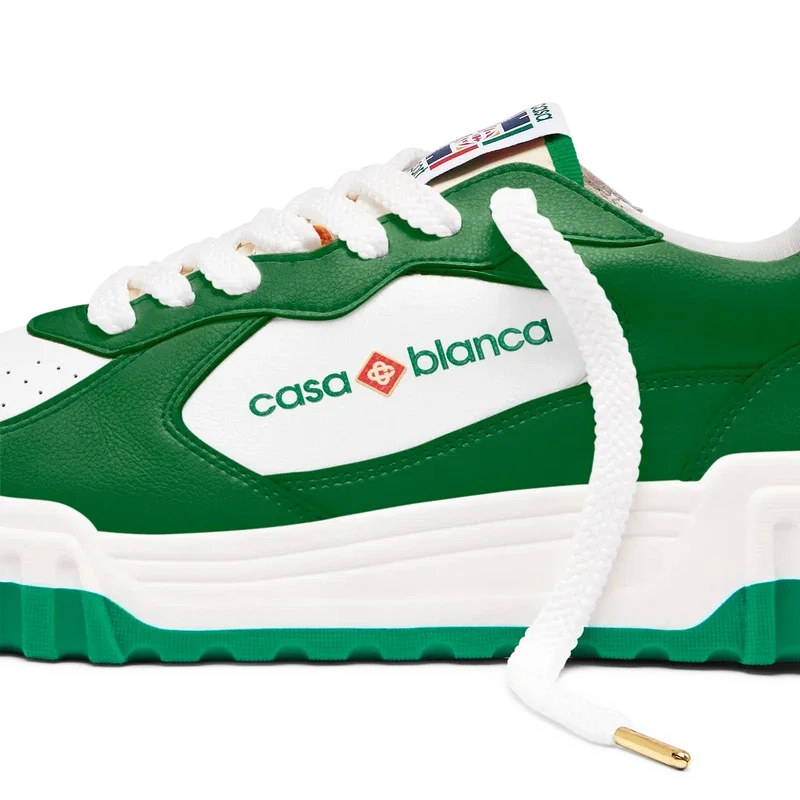 Das markante Casablanca-Branding ist überall deutlich zu erkennen, einschließlich des charakteristischen Diamantmotivs der Marke an der Ferse, der seitlichen Silikon-Wortmarke sowie des gewebten Zungenlabels und der Einlegesohle mit Tennisplatz-Motiv, die dem Schuh seinen Namen „The Court“ geben.