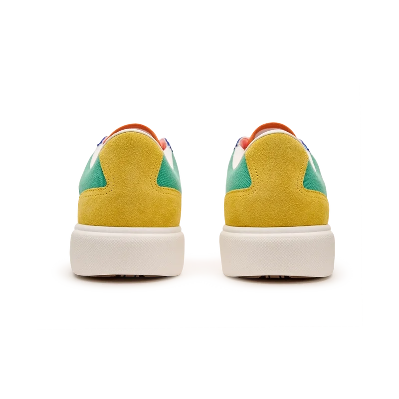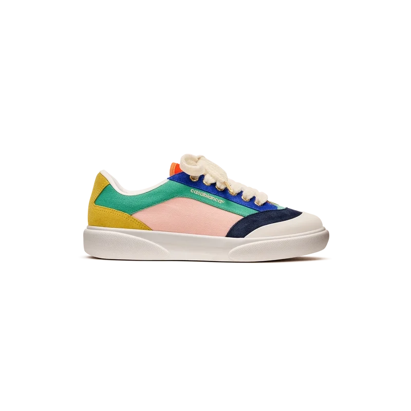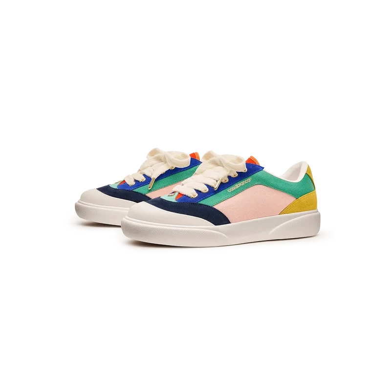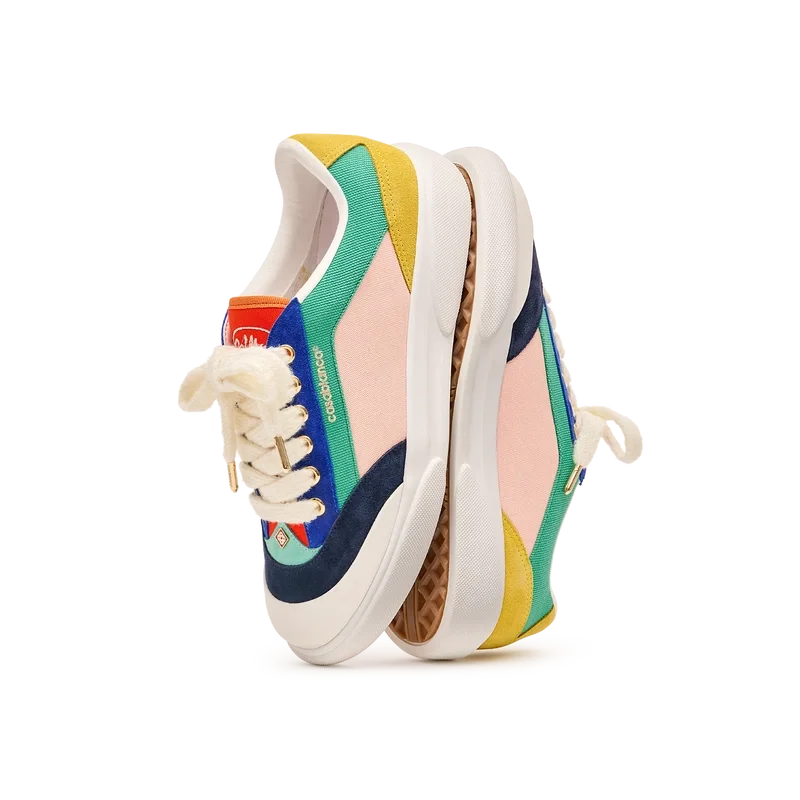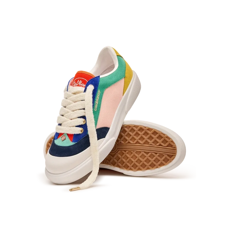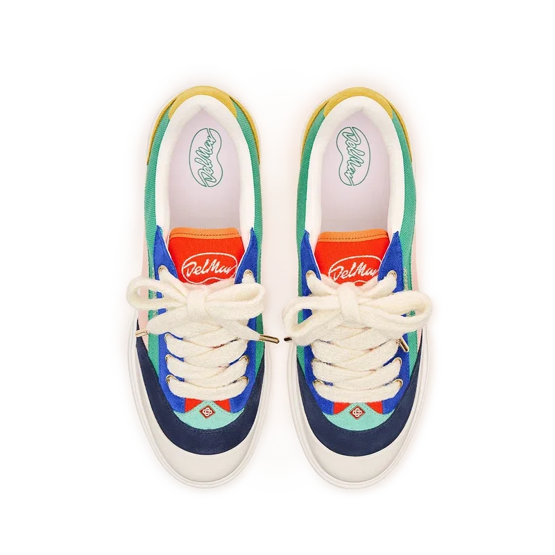 Der mehrfarbige Herren-Sneaker „Del Mar“ hat seinen Namen von dem berühmten Skatepark aus den 1980er Jahren in Kalifornien. Die Del Mar Sneaker sind an klassische Skateschuhe der späten 70er bis frühen 80er Jahre angelehnt. Sie weisen viele Merkmale der frühen Skateschuhe auf, darunter ein Obermaterial mit Canvas-Einsätzen, eine Zehenkappe aus Gummi, eine flache Sohle und dicke Schnürsenkel, kontrastierende Ösen und dezentes Branding. Die grüne Farbgebung ist die klassische Farbe der Marke Casablanca.