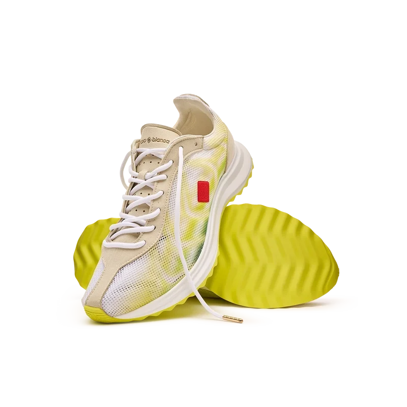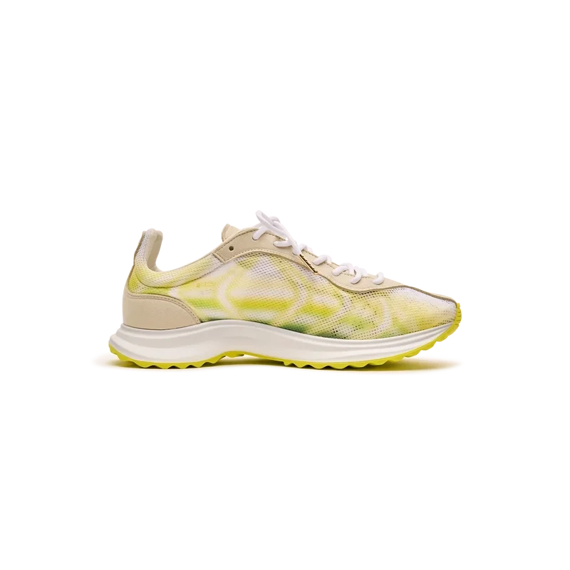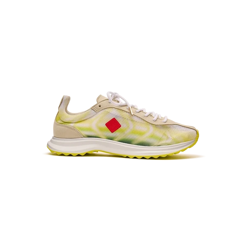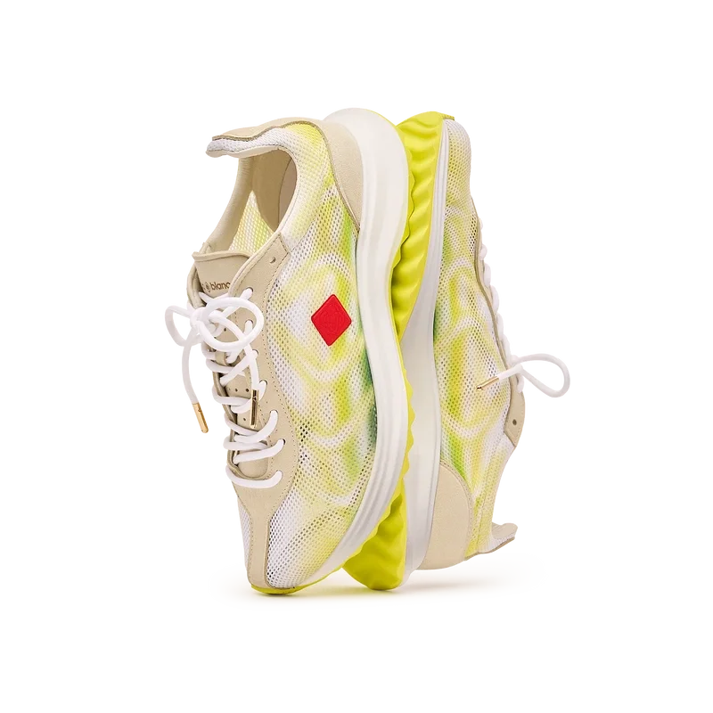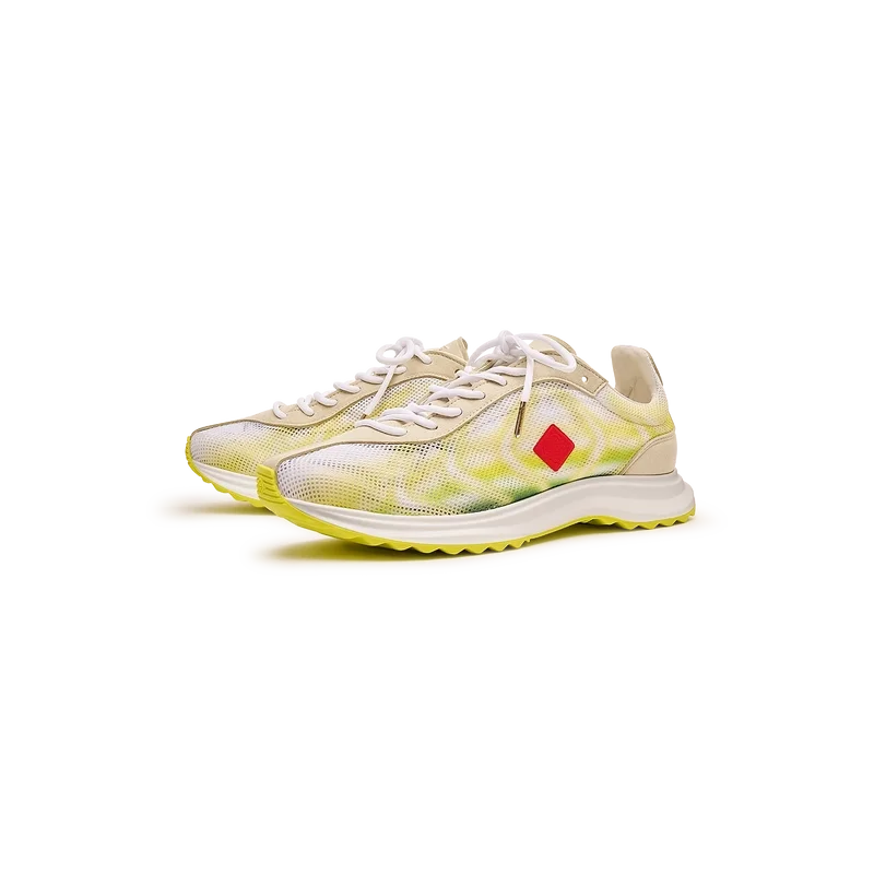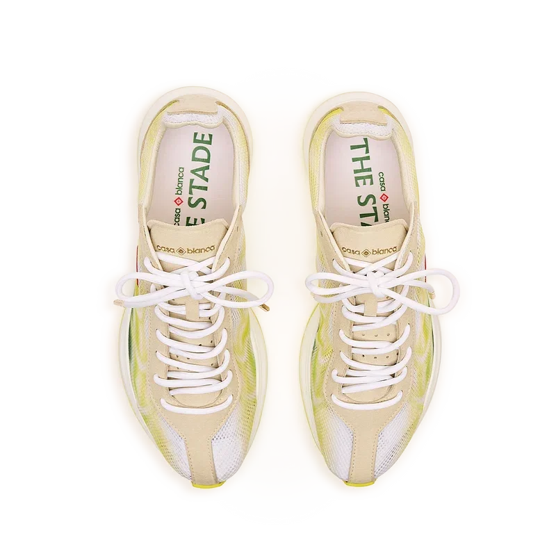 Der Herren-Sneaker „Stade Green“ hat seinen Namen von der antiken griechischen Maßeinheit für die Distanz eines Fußrennens, aus der später das Wort „Stadion“ entstand. Der Stil ist von Performance-Laufschuhen inspiriert und verkörpert die Übertragung moderner Technologie aus alter Tradition; die Merkmale des modernen Laufsports mit dem leichten Mesh und dem Glow-Print unterstreichen die Modernität. Die Sohle weist skulpturale Kurven auf, die eine Anspielung auf unseren Atlantis-Schuh und ein Markenzeichen des Casablanca-Designs sind.