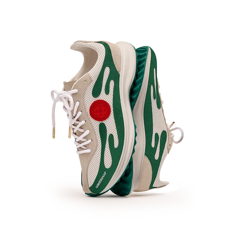 Der weiße und grüne Stade-Sneaker für Herren hat seinen Namen von der antiken griechischen Maßeinheit für die Distanz eines Fußrennens, aus der später das Wort „Stadion“ entstand. Der Stil ist von Performance-Laufschuhen inspiriert und verkörpert den Transfer moderner Technologie aus alter Tradition; die Merkmale des modernen Laufsports mit dem leichten Mesh und dem Glow-Print tragen zur Modernität bei. Die Sohle weist skulpturale Kurven auf, die eine Anspielung auf unseren Atlantis-Schuh und ein Markenzeichen des Casablanca-Designs sind.