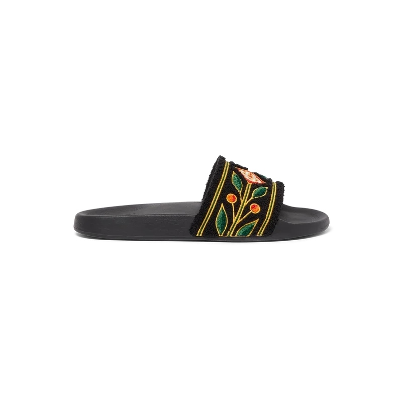 Die Laurel Terry Sliders sind aus besticktem Frottee gefertigt und zieren das Diamant-Logo des Hauses sowie das charakteristische Laurel-Motiv auf dem Obermaterial. Abgerundet durch gepolsterte gummierte Sohlen.