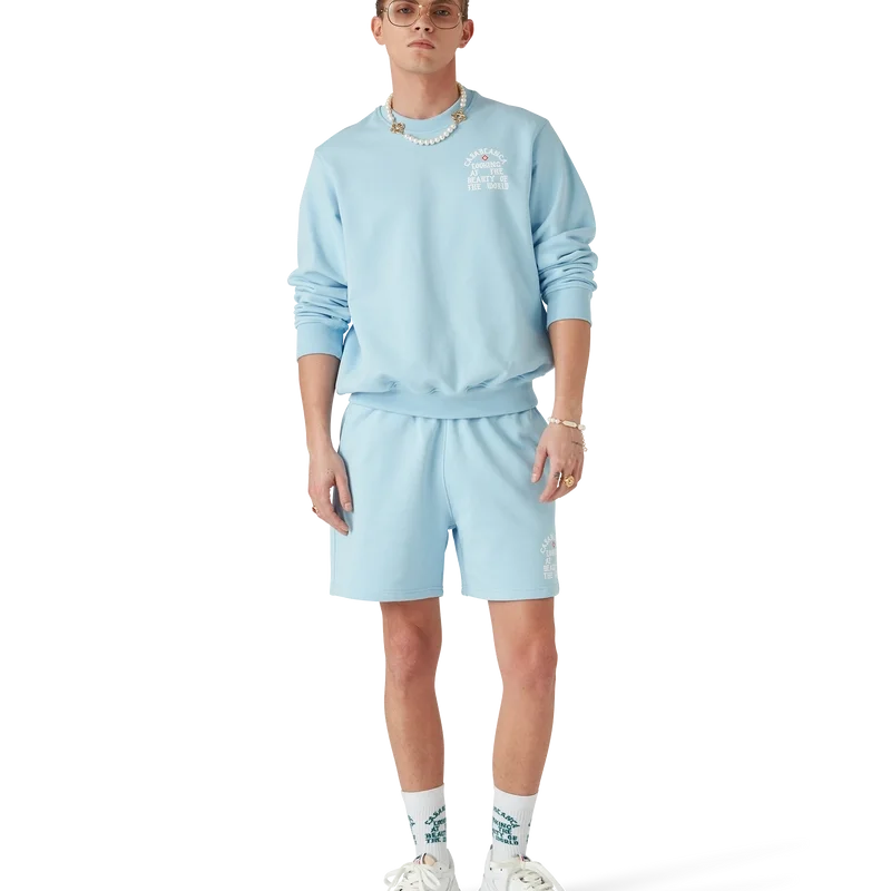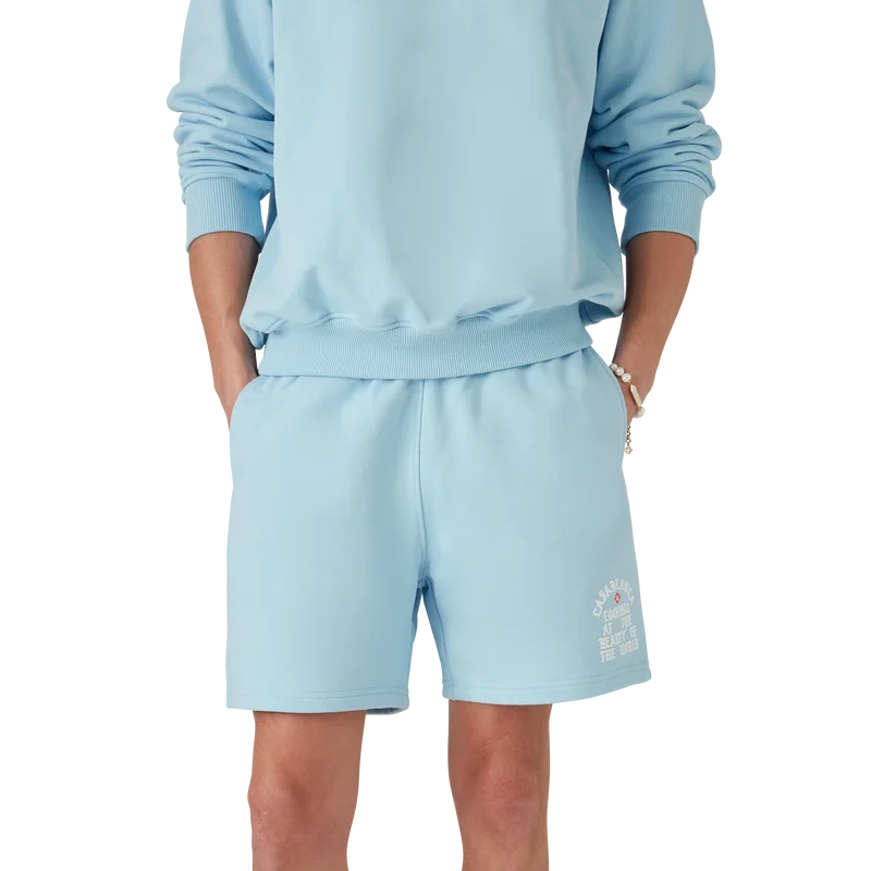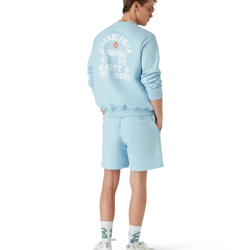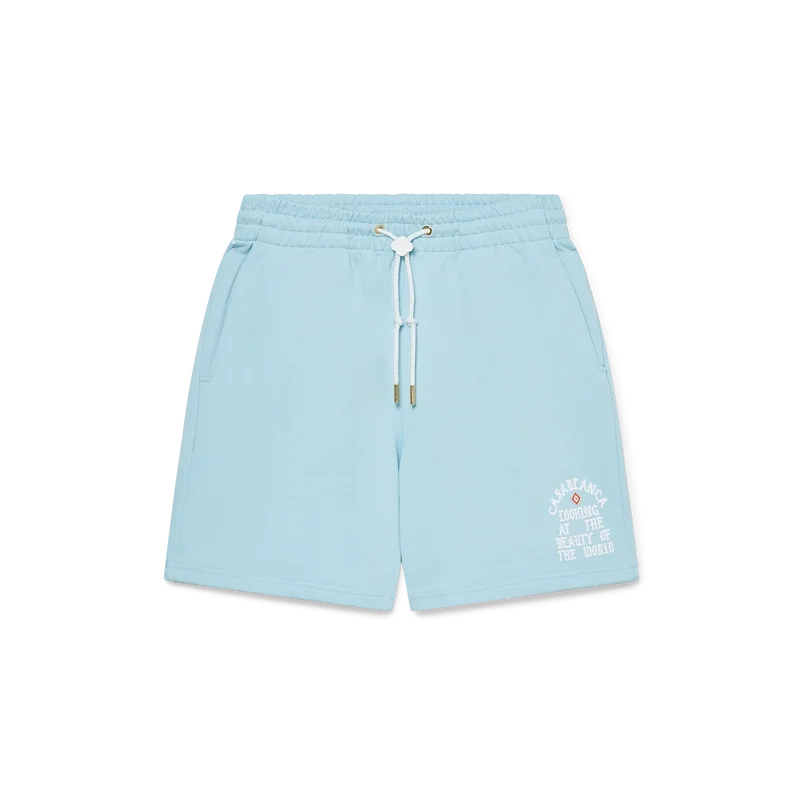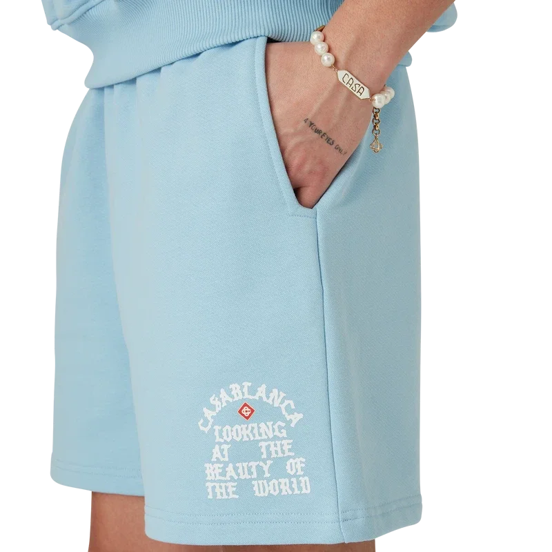 Die Beauty of the World Sweatshorts sind ein Sportbekleidungsdesign aus Bio-Baumwollstoff und zeigen das Motto der Marke Casablanca in gotischer Typografie, inspiriert von der Street-Kultur. Mit elastischem Bund, Kordelzug mit goldenen Enden, schrägen Seitentaschen und einer aufgesetzten Gesäßtasche.