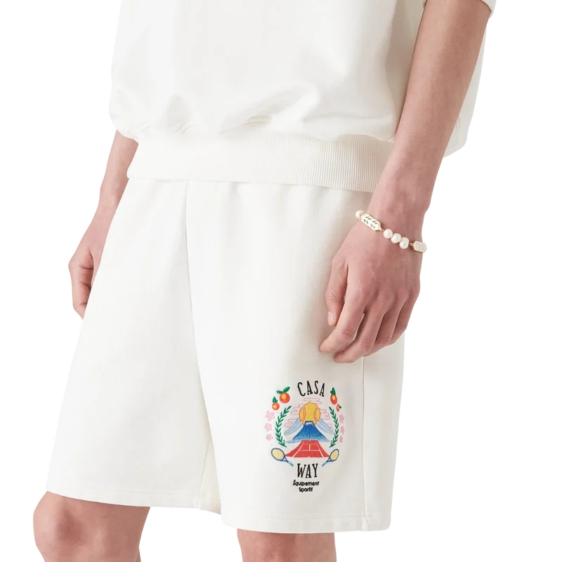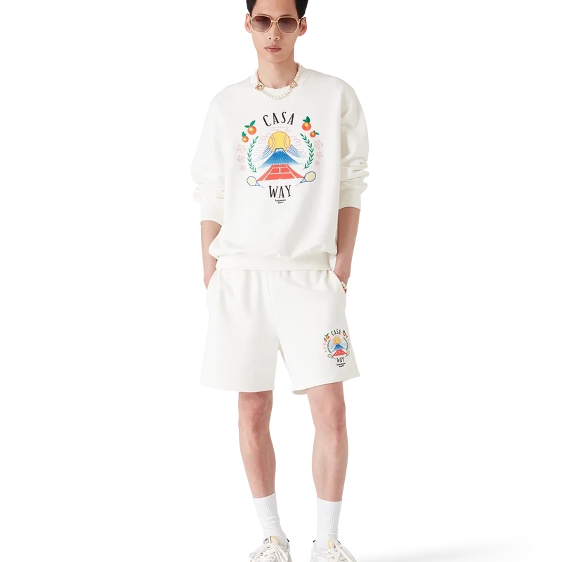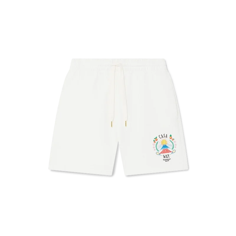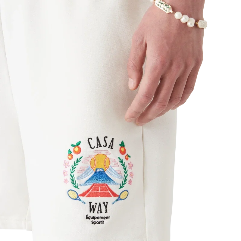 Die Casa Way Mountain Sweatshorts sind ein Sportbekleidungsmodell aus Bio-Baumwollstoff, das mit dem für diese Saison neu interpretierten saisonalen Artwork des Hauses verziert ist. Abgerundet durch einen elastischen Bund mit goldfarbenem Kordelzug, Nahttaschen und einer aufgesetzten Gesäßtasche.