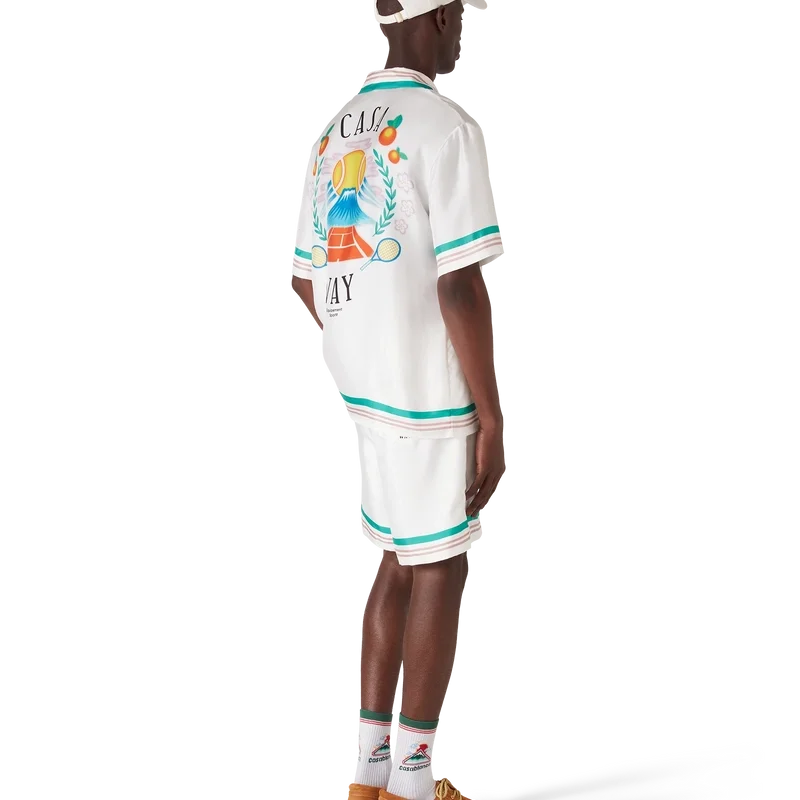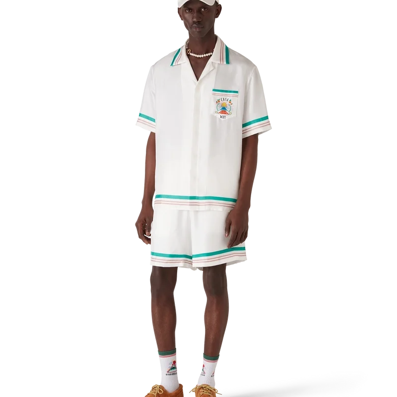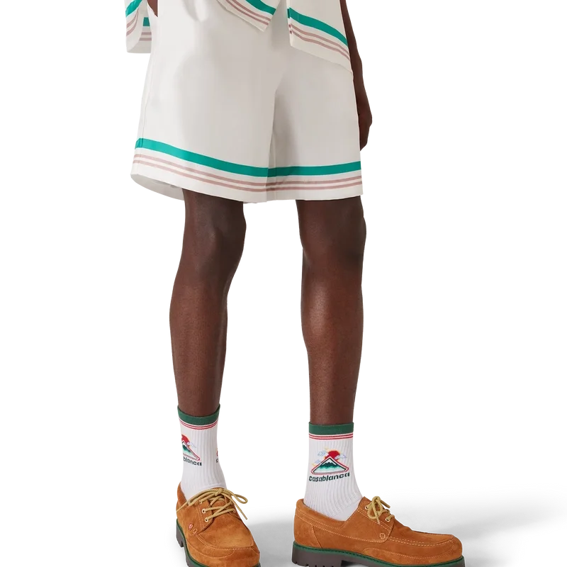 Die Casa Way Seidenshorts sind ein bedrucktes Modell aus Seidentwill. Sie verfügen über einen elastischen Bund, einen Kordelzug, Seitentaschen in den Beinen, eine Gesäßtasche sowie gestreifte Details am Saum und an den Taschen.