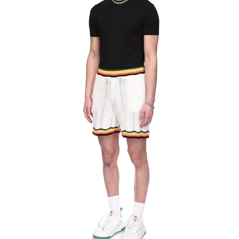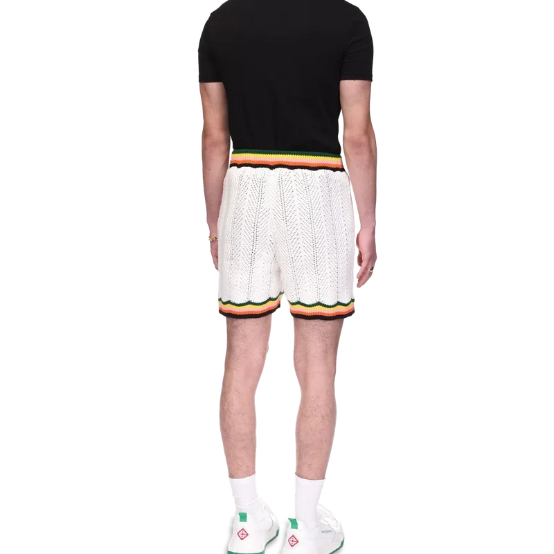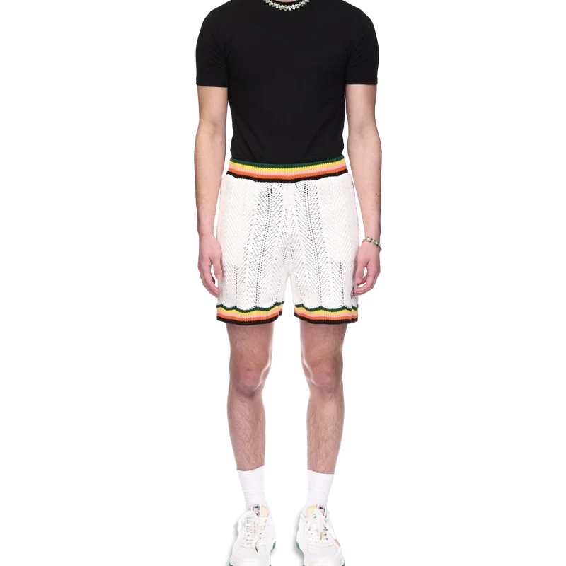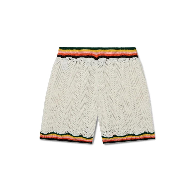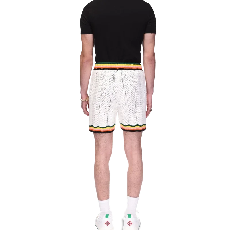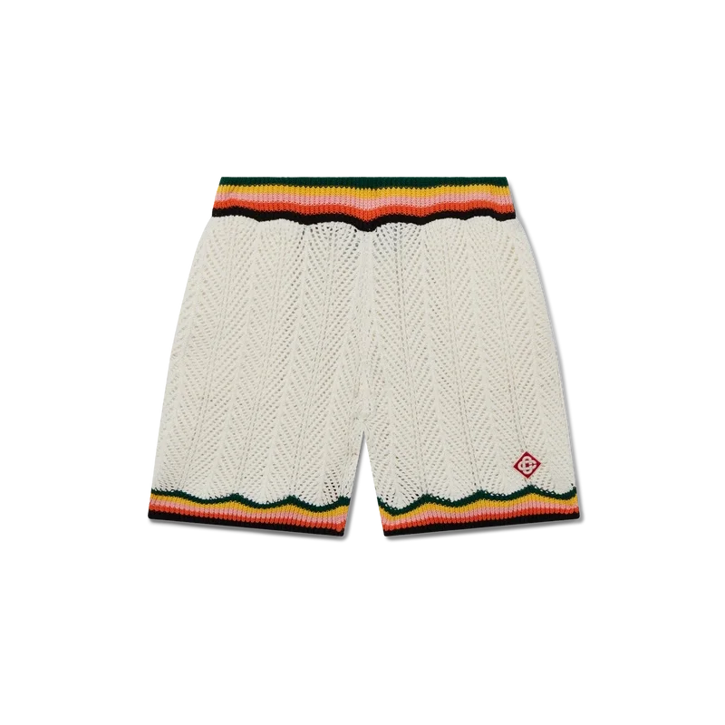 Die Chevron-Spitzen-Shorts sind aus gestricktem Baumwollstoff gefertigt und mit dem charakteristischen Rautenlogo des Hauses versehen. Mit kontrastierendem Chevron-Muster rund um den gerippten Bund und Saum in den Farben der Saison, Seitentaschen und innerem Kordelzug.