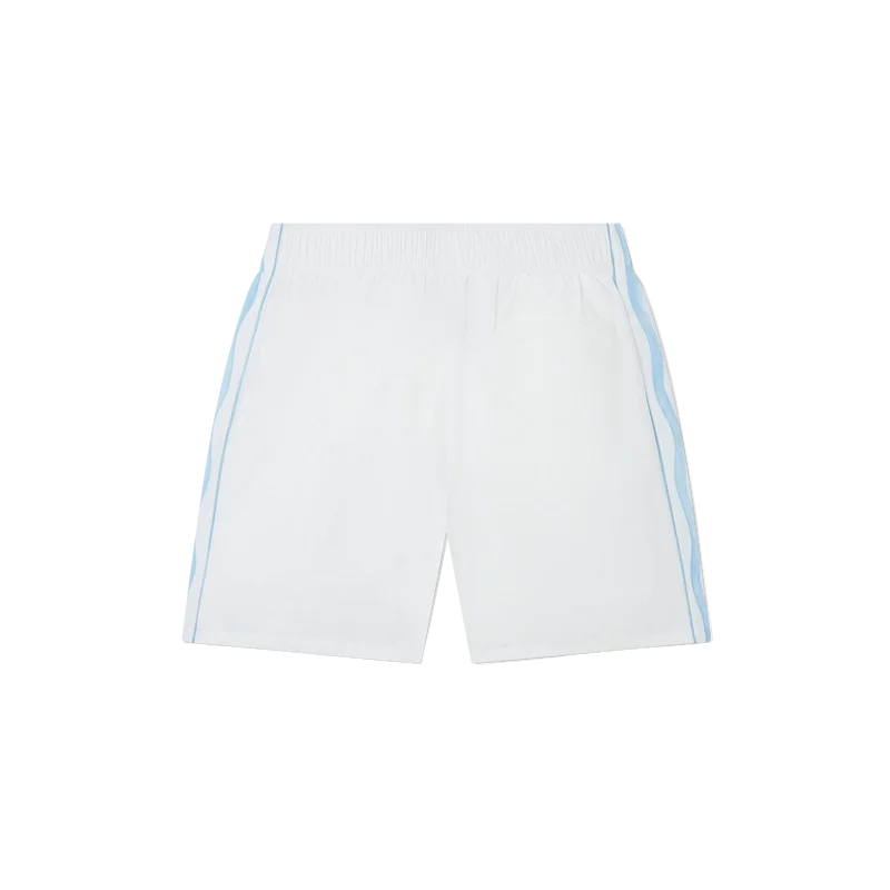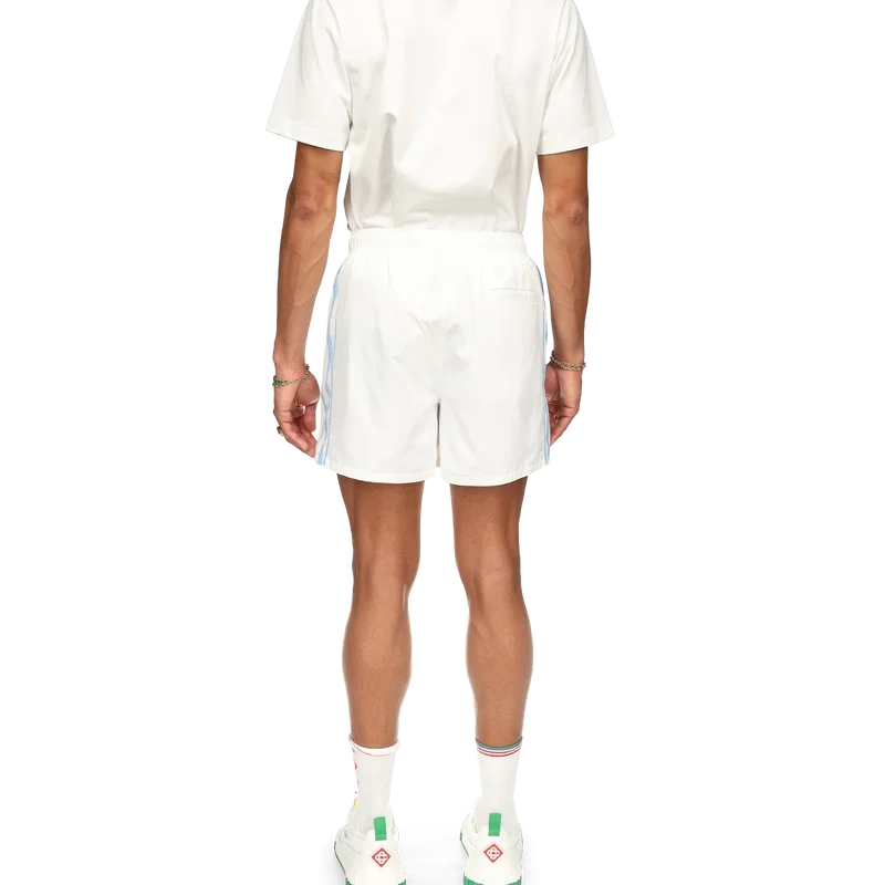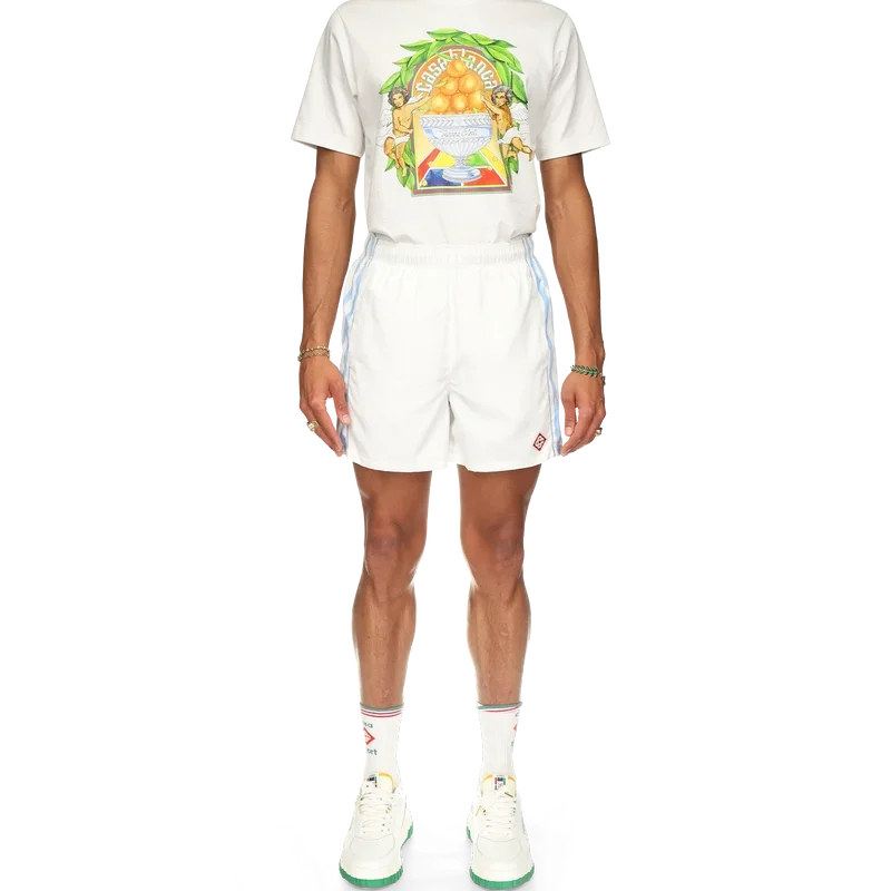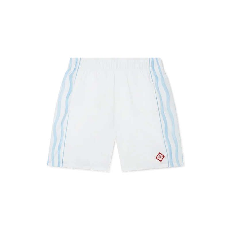 Die Equipement Sportif Track Shorts sind aus 100 % Polyester gefertigt und gefüttert und verfügen über blau-weiß gewellte Streifen an den Seitenteilen. Ausgestattet mit Vordertaschen und einer Gesäßtasche, einem elastischen Bund, dem Diamant-Logo des Hauses und einem Casablanca-Markenlabel.