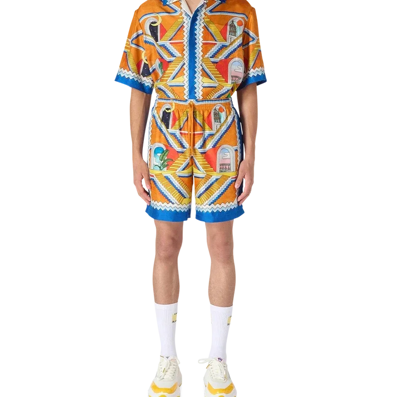 Die Escalier Infini Seidenshorts für Herren zeigen das strahlende, endlose Treppenmotiv dieser Saison. Mit kontrastierendem blau-weißem Zickzack-Saum und Kordelzug in der Taille.