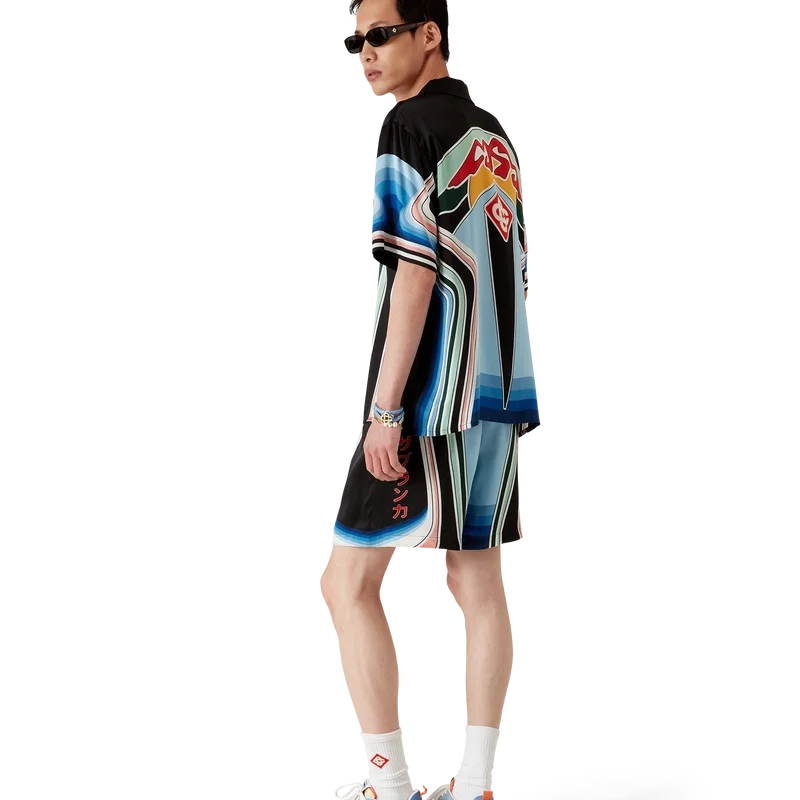 Die Graphic Mountain Seidenshorts sind ein durchgehend bedrucktes Design aus Seidensatin. Mit elastischem Bund, Kordelzug, Seitentaschen in den Beinen und einer Gesäßtasche.