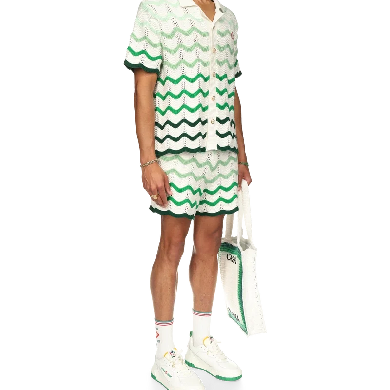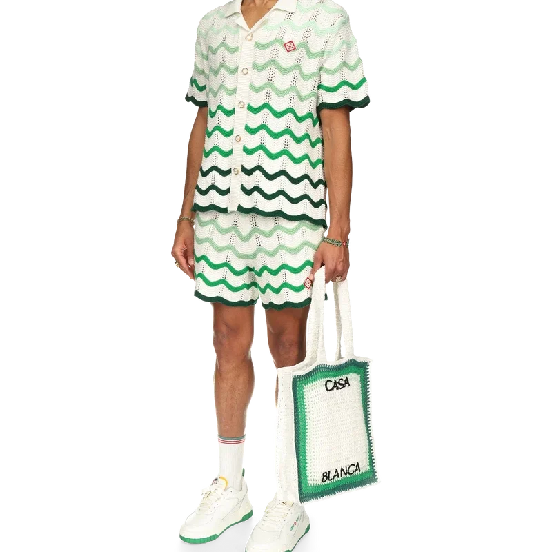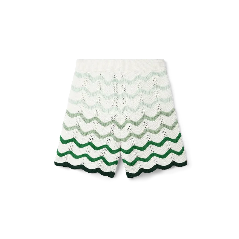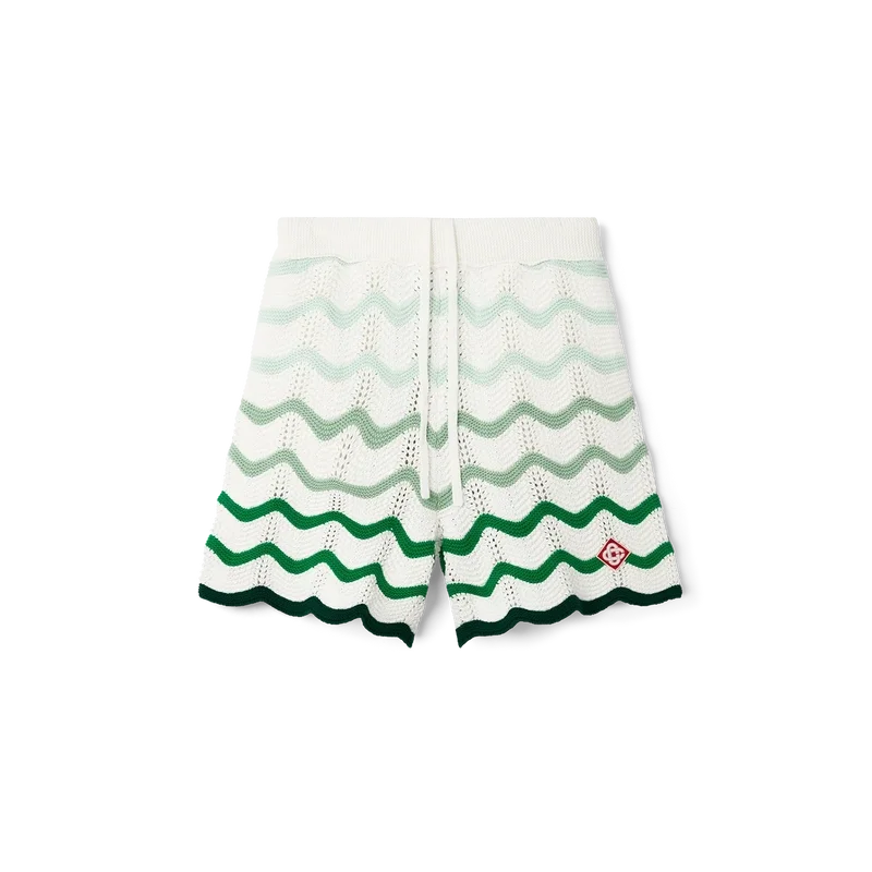 Die Häkelshorts mit wellenförmigem Farbverlauf sind ein typisches Casablanca-Modell aus einem weichen, strukturierten, offen gewebten Häkelstoff. Mit innerem Kordelzug, dem Diamant-Logo des Hauses und einem Casablanca-Markenlabel versehen.