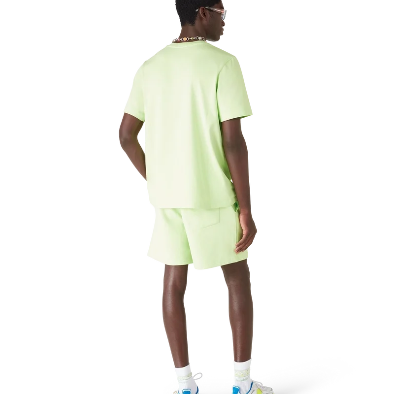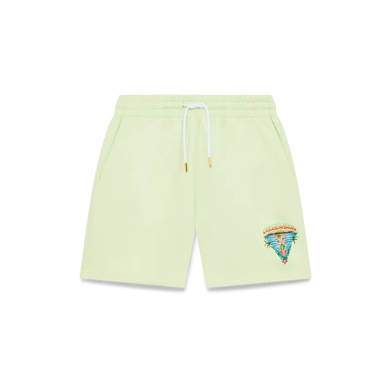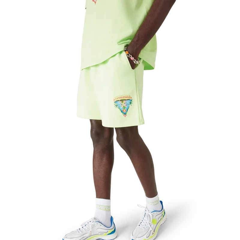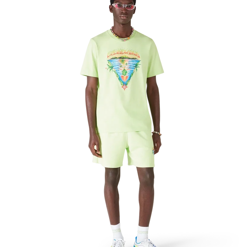 Die Innocence Triangle Sweatshorts zeichnen sich durch ein raffiniertes Design aus, das eine Meeresszene bei Sonnenuntergang mit einer Insel im Zentrum zeigt, dargestellt in einem Stil, der von klassischer Surf-T-Shirt-Kunst beeinflusst ist. Das Motiv fängt die ätherische Schönheit der goldenen Stunde über tropischen Gewässern ein und präsentiert eine idealisierte Vision eines Strandparadieses durch die raffinierte Sport-Leisure-Linse des Hauses. Abgerundet durch einen klassischen Rundhalsausschnitt, gerippte Säume und die für die Marke typische Sport-Leisure-Ästhetik.