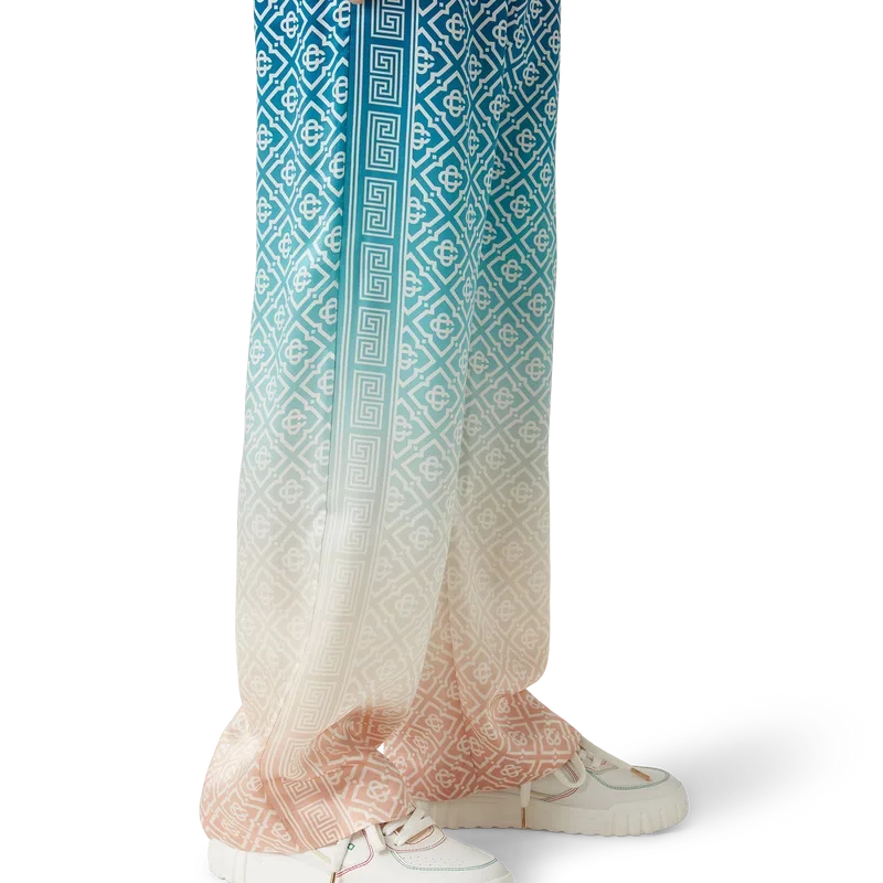 Die Jacquard-Seiden-Hose mit Farbverlauf ist ein durchgehend bedrucktes Modell mit dem charakteristischen Monogramm des Hauses, gefertigt aus Seidensatin. Mit elastischem Bund, Seitentaschen und Futter.