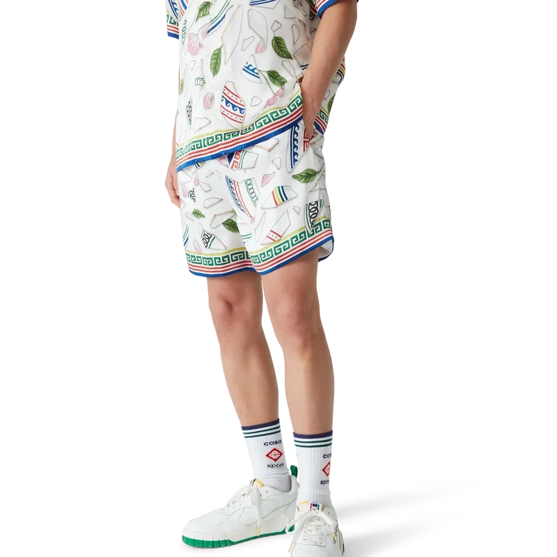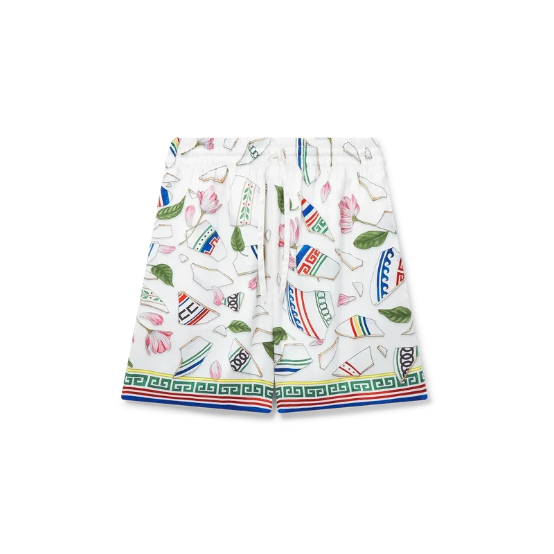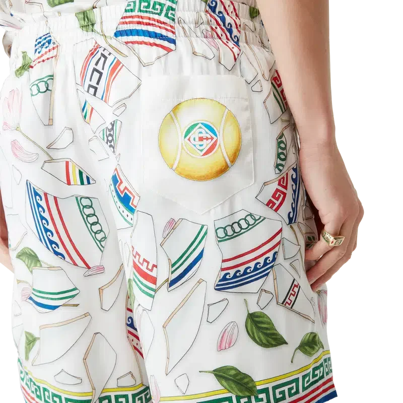 Die Le Vase Brise Seidenshorts sind ein durchgehend bedrucktes Design aus Seidensatin, das das saisonale Kunstwerk des Hauses zeigt, das sich wiederholende Fragmente einer zerbrochenen Vase darstellt. Abgerundet durch einen elastischen Bund, Seitentaschen in den Beinen, eine aufgesetzte Gesäßtasche, einen Kordelzugverschluss und ein vom griechischen Schlüsselmuster inspiriertes Detail am Saum.