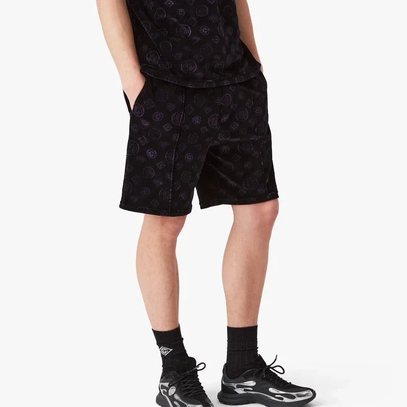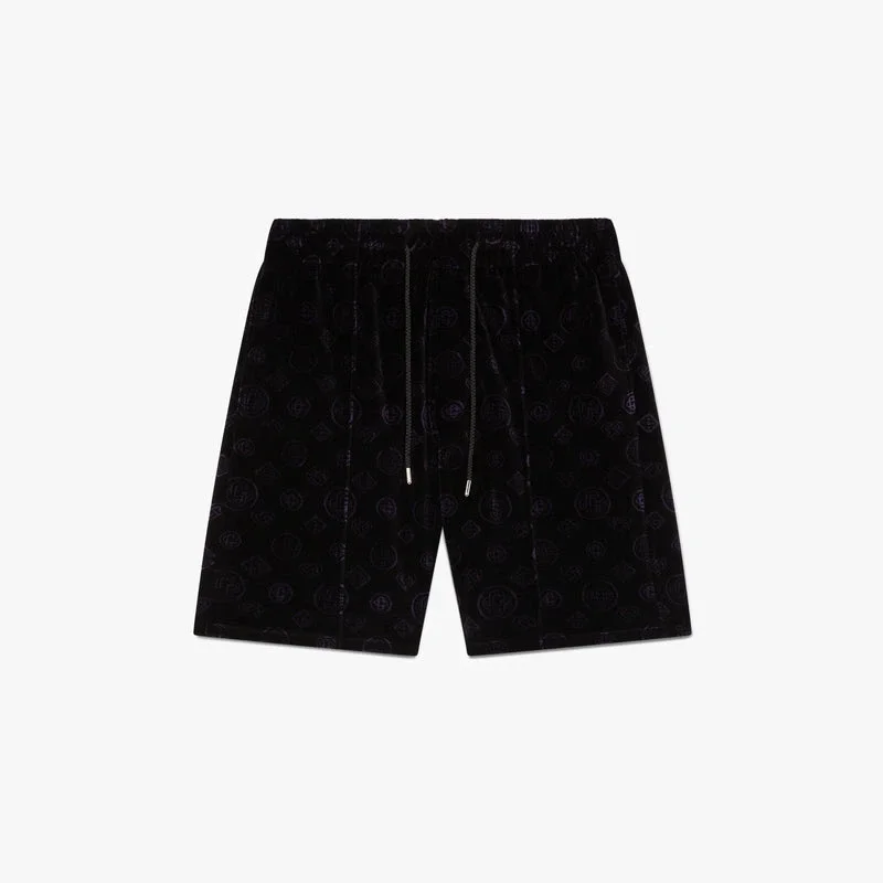 Die lila Velours-Shorts mit Monogramm zeichnen sich durch ein raffiniertes Design aus und sind durchgehend mit dem ikonischen Monogramm-Muster des Hauses verziert.