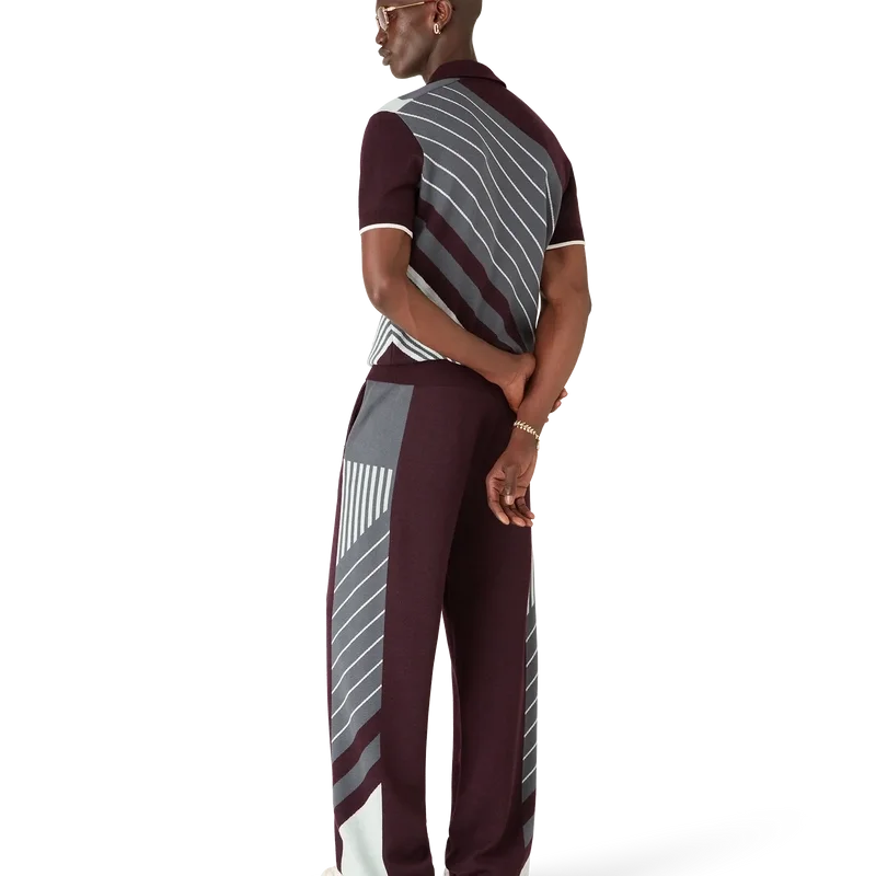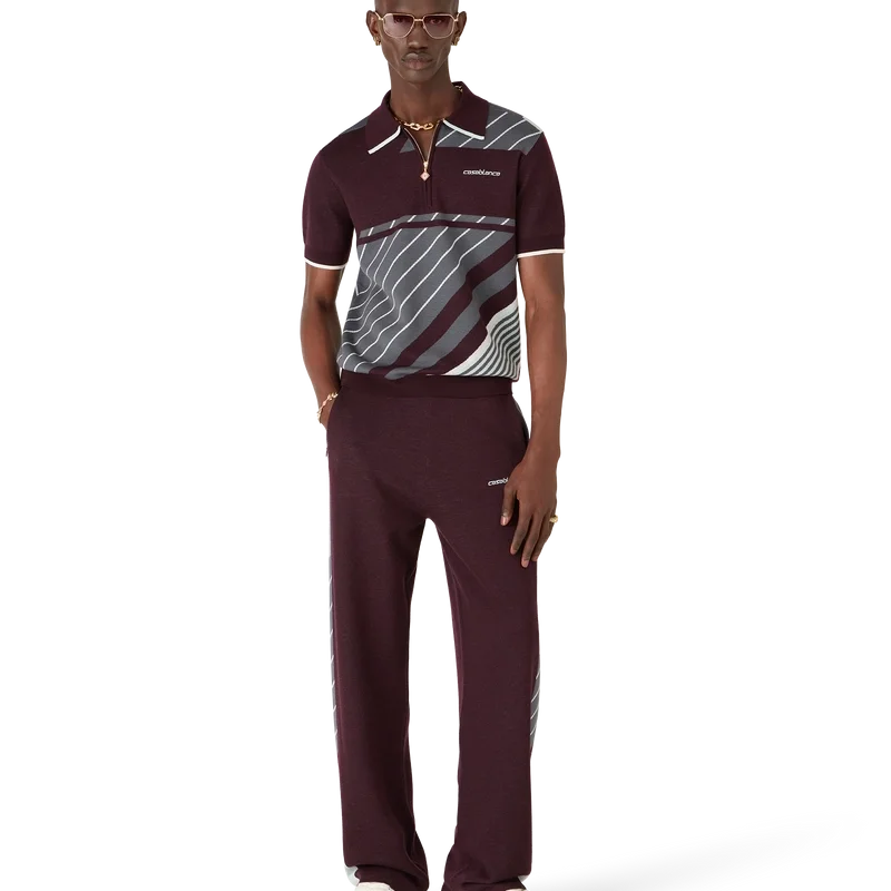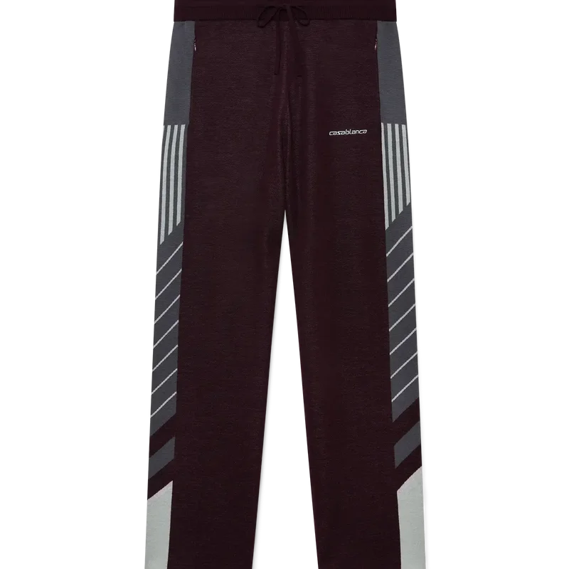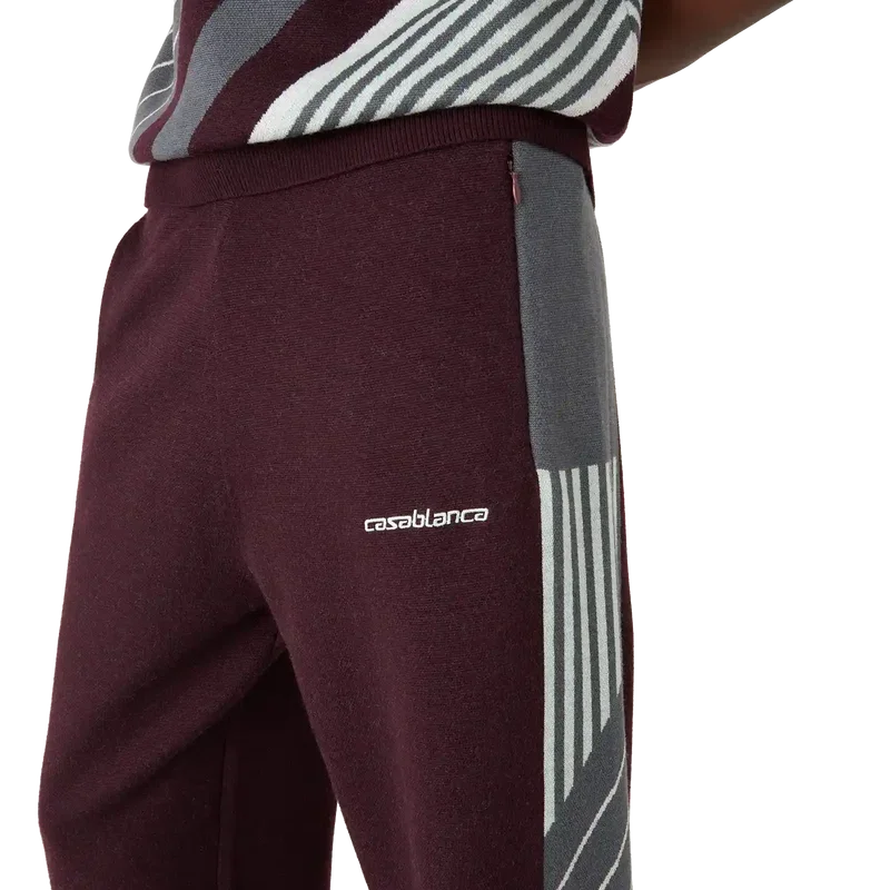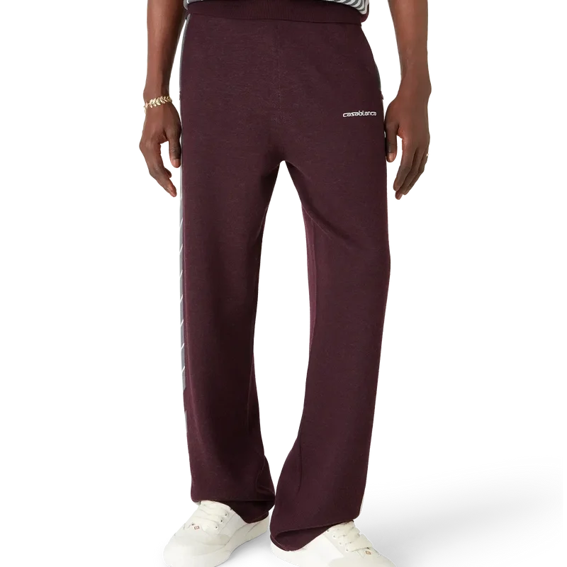 Die Merino Diagonal Tennis-Hose ist ein gestricktes Modell mit geradem Bein und einem gestickten Casablanca-Logo. Sie verfügt über einen elastischen Bund, seitliche Eingrifftaschen mit Reißverschluss, diagonale Streifendetails an den Seiten und einen Kordelzug.