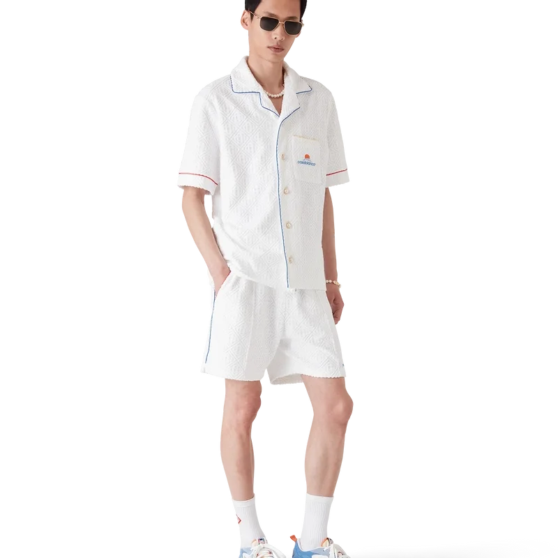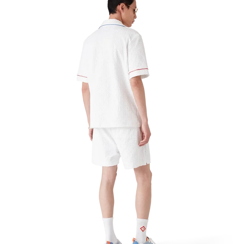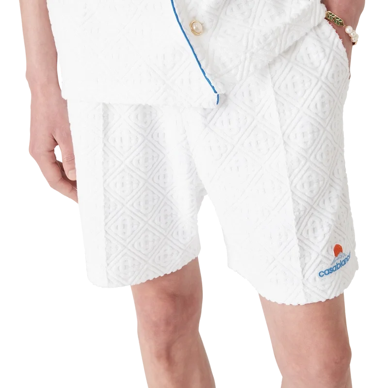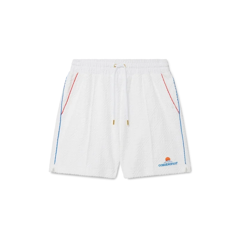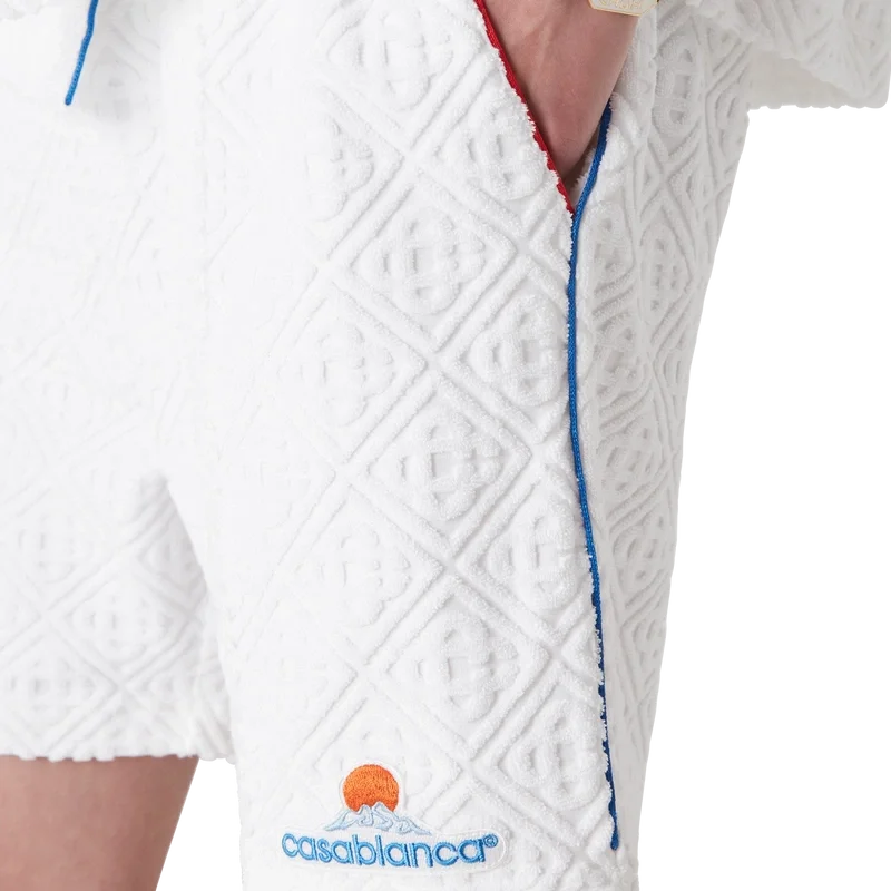 Die Monogram-Frottee-Shorts sind ein klassisches Design aus Monogram-Frottee. Mit elastischem Bund, Kordelzug mit goldenen Enden, goldenen Ösen, Biesen an der Vorderseite, einer Gesäßtasche, schrägen Vordertaschen sowie Paspeldetails an den Gesäß- und Vordertaschen sowie an den Seiten.