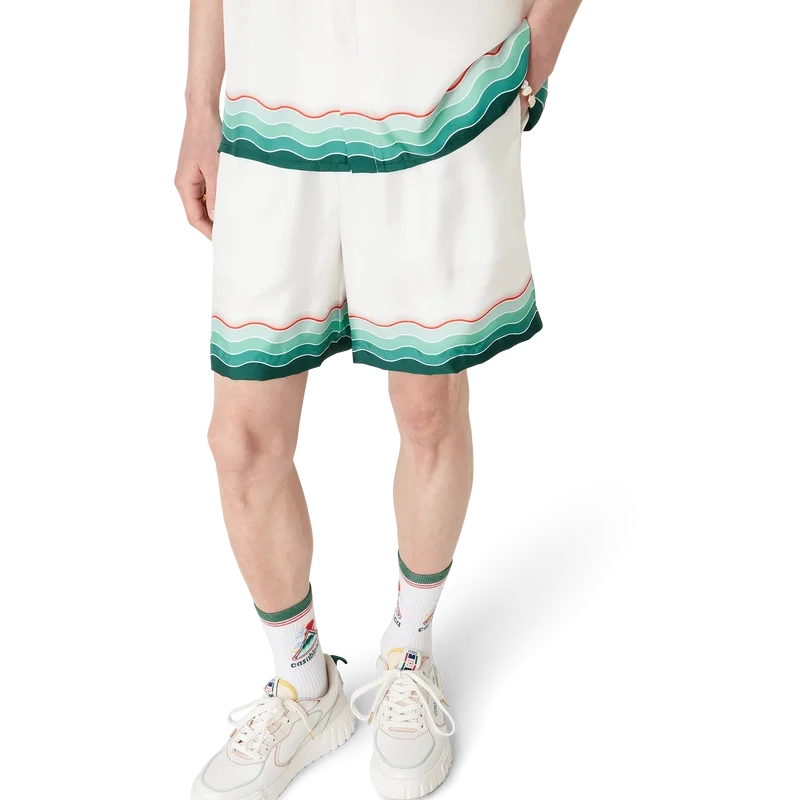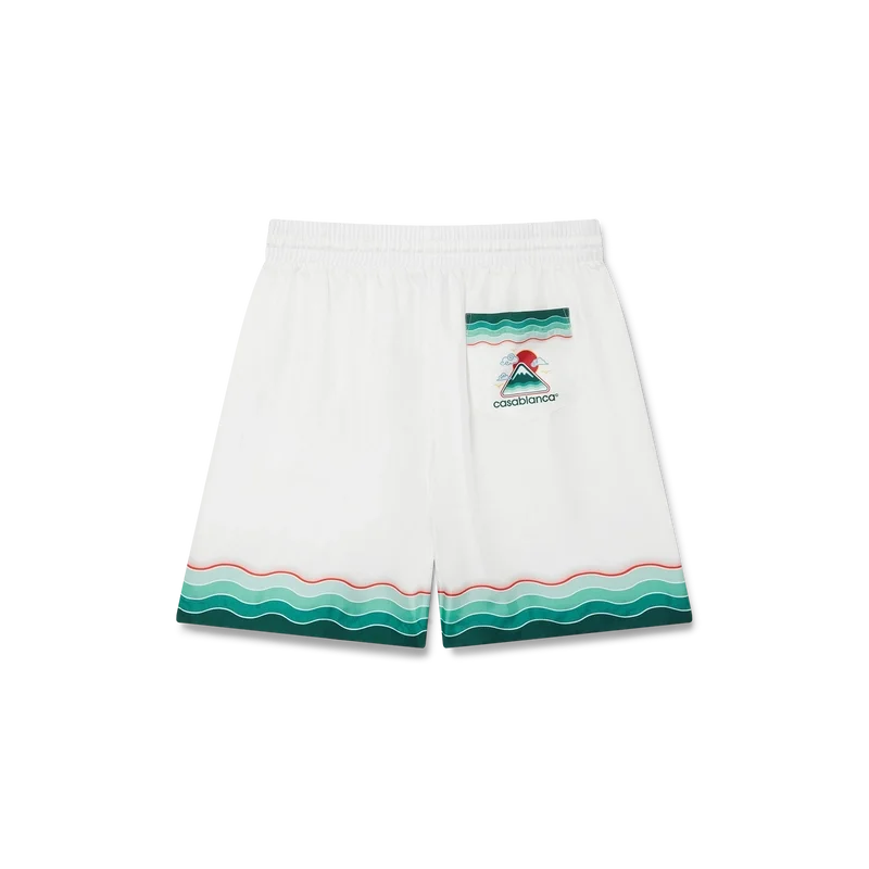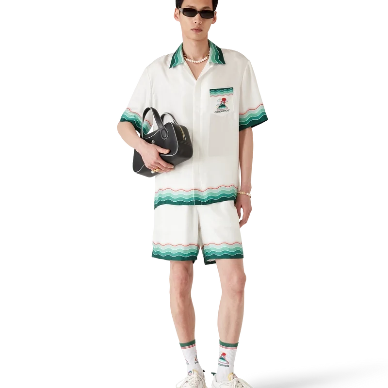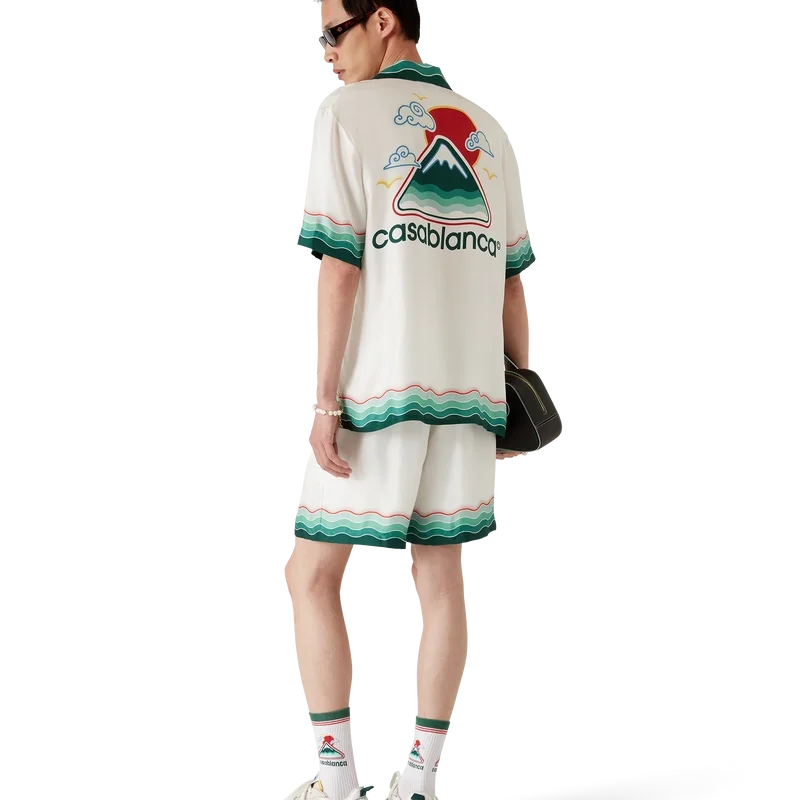 Das Montagne Ondulee Seidenhemd ist ein kurzärmeliges Modell mit Allover-Print, das das saisonale Artwork des Hauses zeigt – inspiriert von Japans reichhaltiger Ikonografie, vermittelt es mit schlichtem Layout und Kunstwerk eine starke visuelle Botschaft mit nur wenigen Linien und Farben und ist damit eines der Aushängeschilder der Kollektion – gefertigt aus Seidentwill. Abgerundet durch einen elastischen Bund, einen Kordelzug, Seitentaschen in den Beinen, eine Gesäßtasche sowie von der Memphis-Welle inspirierte Streifenverzierungen am Saum und an der Gesäßtasche.