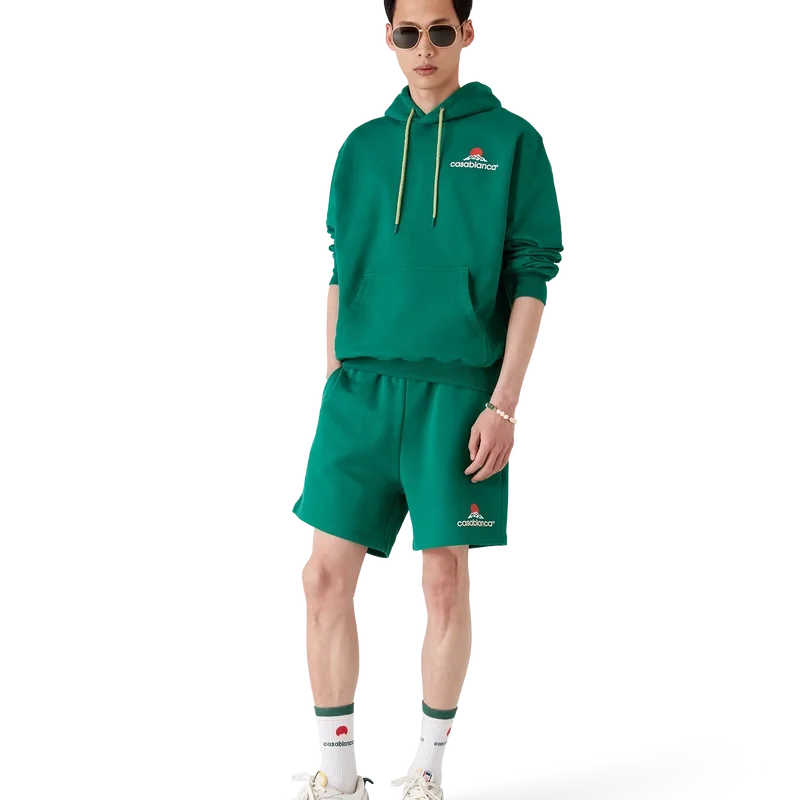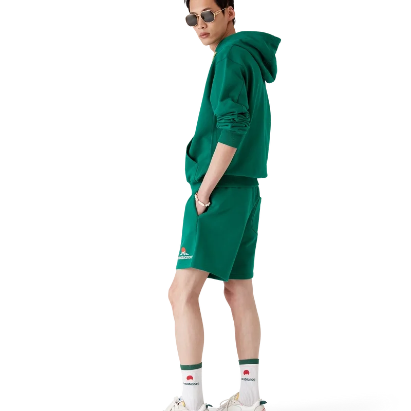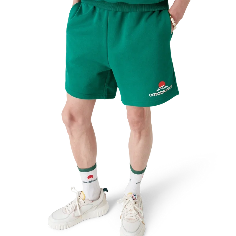 Die Casablanca Montagne Sweatshorts sind ein Sportbekleidungsmodell aus Baumwolljersey, das mit dem saisonalen Motiv des Hauses verziert ist – einem Logo, das auf den ersten Blick wie ein Berg aussieht, bei genauerem Hinsehen jedoch „Casa“ erkennen lässt. Abgerundet durch einen elastischen Bund, einen Kordelzug mit goldenen Enden, Nahttaschen und eine aufgesetzte Gesäßtasche.