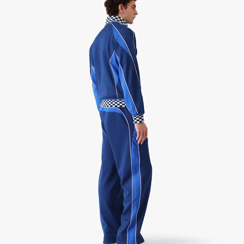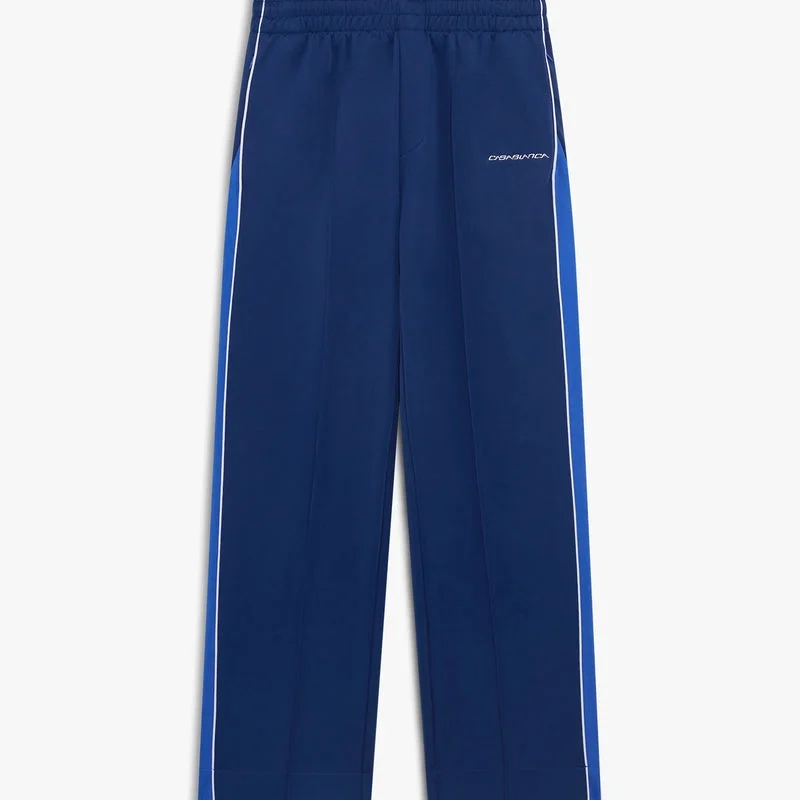 Die Navy Cyber Tricot Trainingshose besticht durch ein raffiniertes Design mit geradem Bein und verkörpert den gehobenen Ansatz des Hauses in Sachen Sportbekleidung. Sie verfügt über einen elastischen Bund, einen Kordelzug, schräge Seitentaschen, blaue Streifen an den Seiten, Biesen an der Vorderseite, eine Gesäßtasche und das Casablanca-Logo des Hauses.