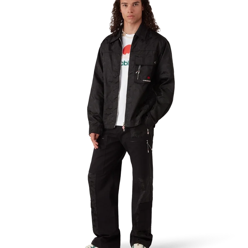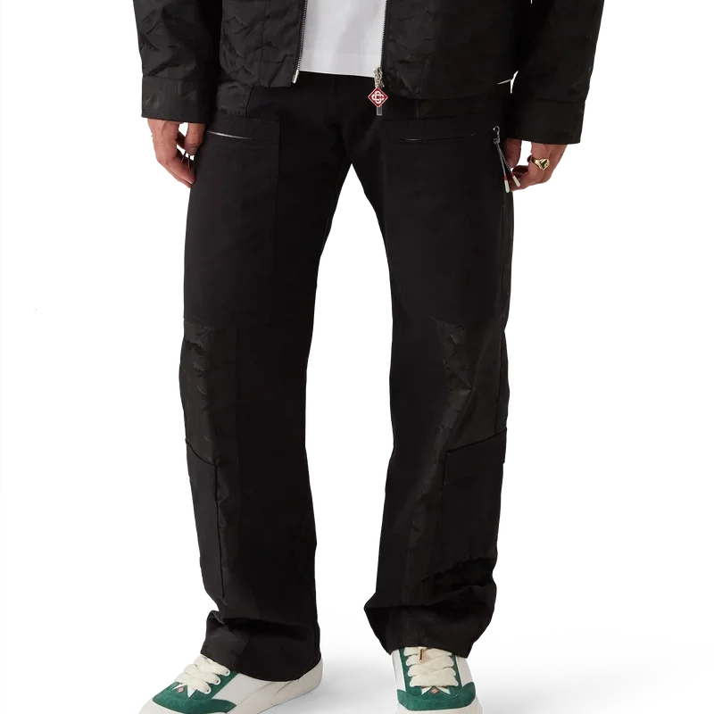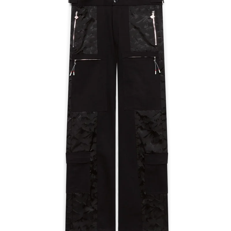 Die Nylon Mountain Camo Cargo-Hose ist ein Modell mit geradem Bein aus Jacquard-Nylon und Baumwollstoff. Ausgestattet mit Eingrifftaschen mit Reißverschluss und den für das Haus typischen Reißverschlusslaschen mit Diamant-Logo, einem Futter, aufgesetzten Taschen an den Oberschenkeln mit Reißverschluss und von Bergsteigerseilen inspirierten Kordelzuglaschen, Pattentaschen an den Unterschenkeln, aufgesetzten Gesäßtaschen, einem Reißverschluss und seitlichen Weitenreglern.