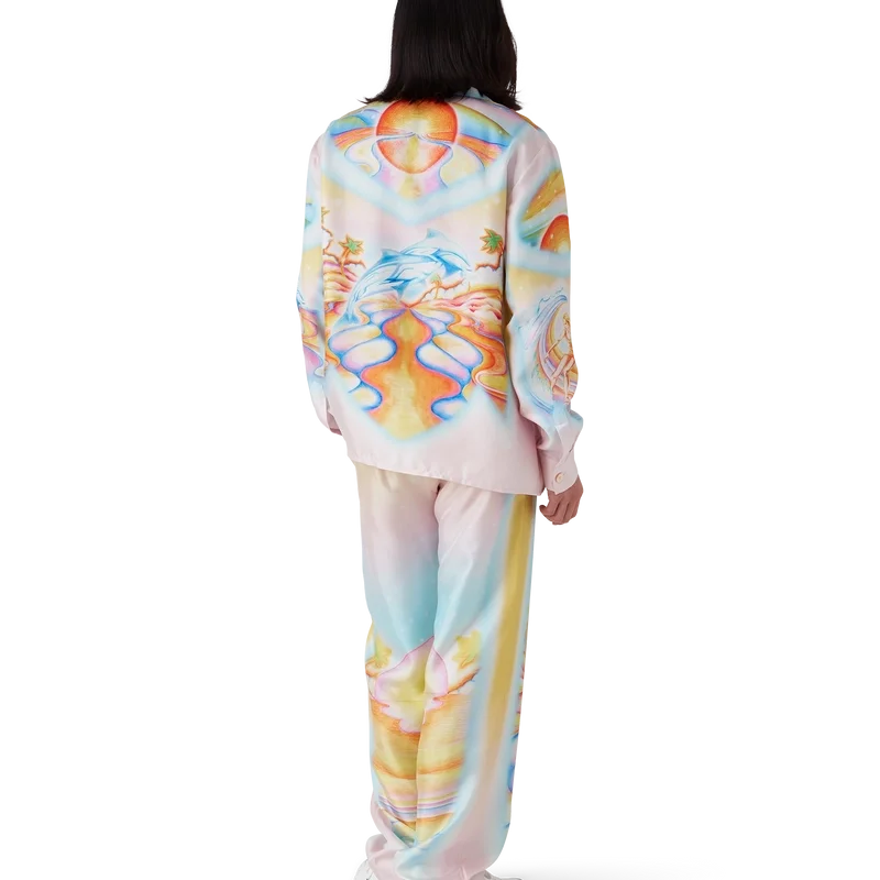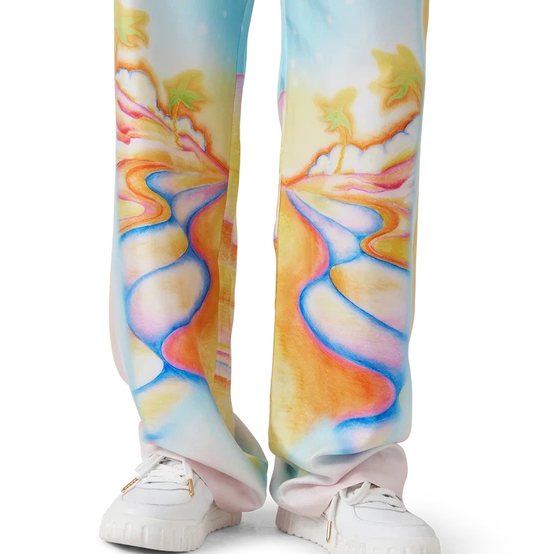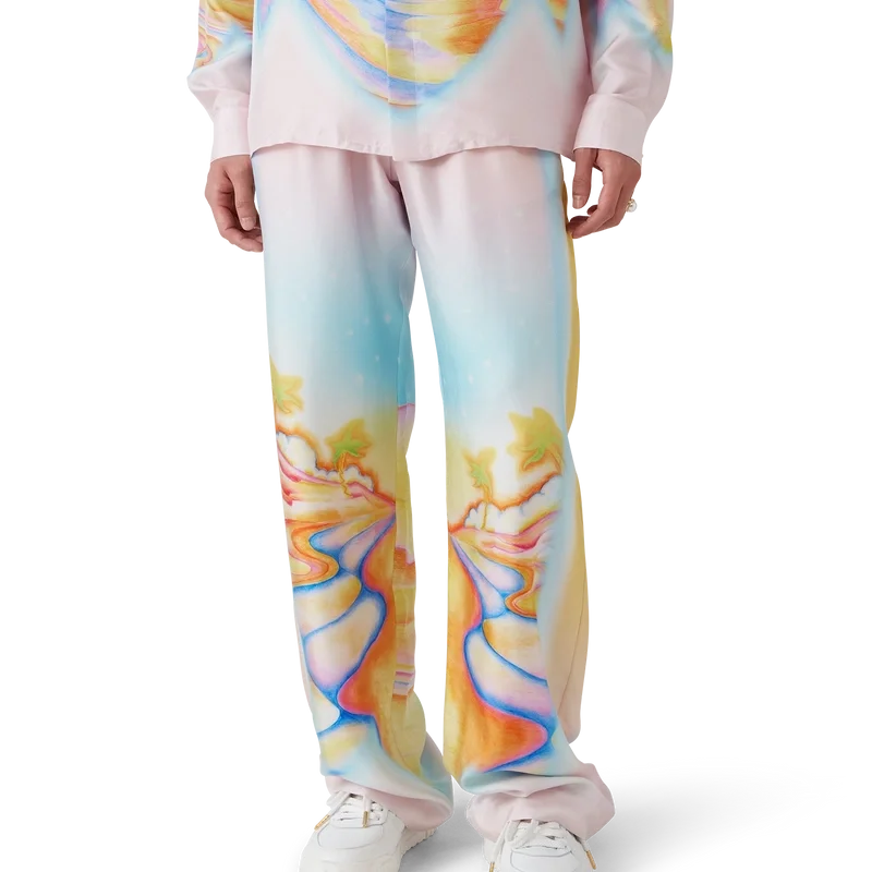 Die Seidenhose „Psychedelic Nirvana“ ist ein durchgehend bedrucktes Modell aus Seidentwill, dessen Design von den Airbrush-Motiven kalifornischer Surfbretter der 70er Jahre inspiriert ist. Die pastelligen Farben verleihen dem Druck eine fast traumhafte, idealistische Anmutung. Die Hose verfügt über einen elastischen Bund, einen Kordelzug, Seitentaschen in den Beinen und eine aufgesetzte Gesäßtasche.