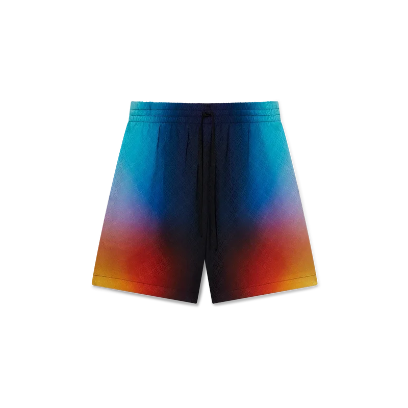 Die Seidenshorts mit Farbverlauf sind ein bedrucktes Design mit den Farbverläufen der Saison, gefertigt aus Seidenstoff. Mit elastischem Bund, Kordelzug, Seitentaschen in den Nähten und einer aufgesetzten Gesäßtasche. Entworfen, um mit dem passenden Seidenhemd mit Farbverlauf getragen zu werden.
