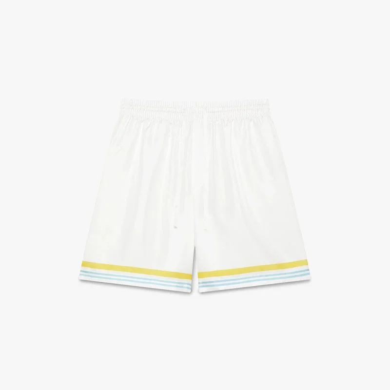 Die Tennis Landscape Seidenshorts zeichnen sich durch ein raffiniertes Design aus, das das „Tennis Landscape“-Motiv zeigt, bei dem miteinander verbundene Rahmen Nischen mit verschiedenen Szenen bilden, die durch den Fokus auf den Sport die Transzendenz von Zeit und Ort beschreiben. Abgerundet durch einen elastischen Bund, einen Kordelzug, ein Futter, Seitentaschen in den Beinen, eine aufgesetzte Gesäßtasche sowie gestreifte Details an Saum und Taschen.