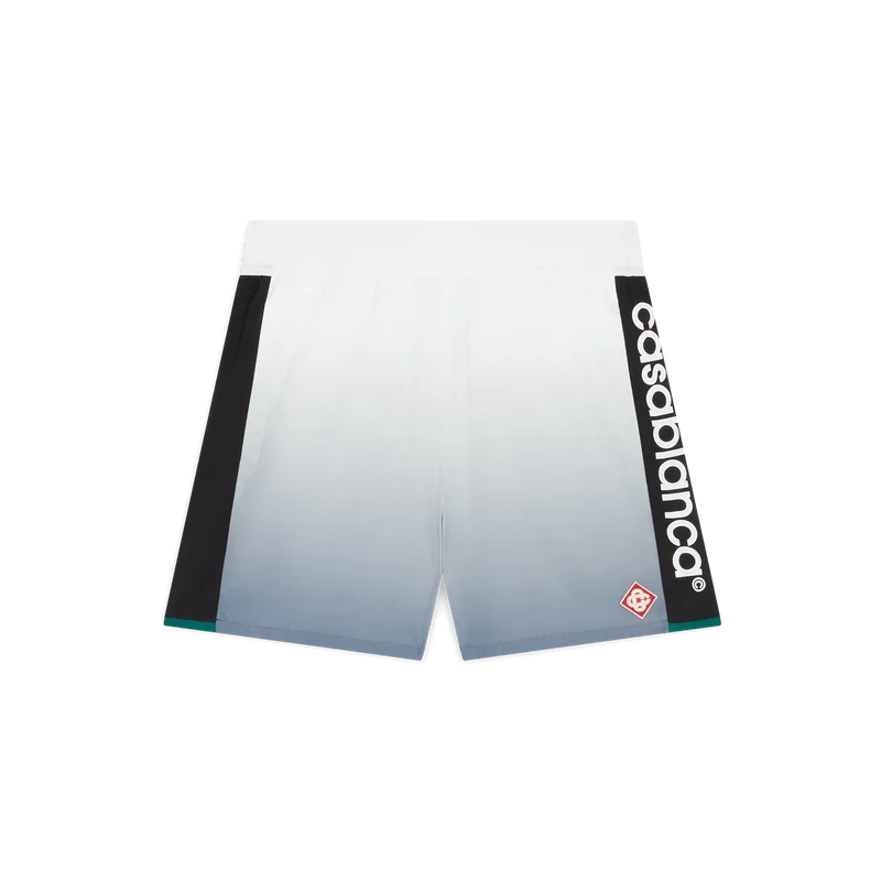 Die silbernen Shorts im Shellsuit-Stil mit Farbverlauf sind ein Sportbekleidungsmodell aus einem silbernen Stoff mit Farbverlauf, das an der Seite mit dem charakteristischen Casablanca-Logo des Hauses verziert ist. Abgerundet durch einen elastischen Bund mit Kordelzug, schwarze Einsätze an den Seiten und seitliche Eingrifftaschen.
