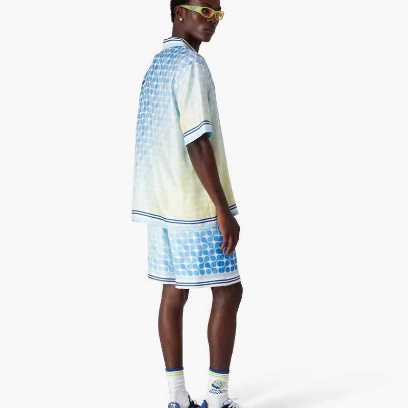 Die Tennis Tile Seidenshorts zeichnen sich durch ein raffiniertes Design aus, das das saisonale Motiv mit einem wellenförmigen Muster aus sich kreuzenden Logos und Tennisbällen auf einem saisonalen Farbverlaufshintergrund zeigt. Abgerundet durch einen elastischen Bund, einen Kordelzug, Seitentaschen in den Beinen, eine aufgesetzte Gesäßtasche und gestreifte Saumdetails.