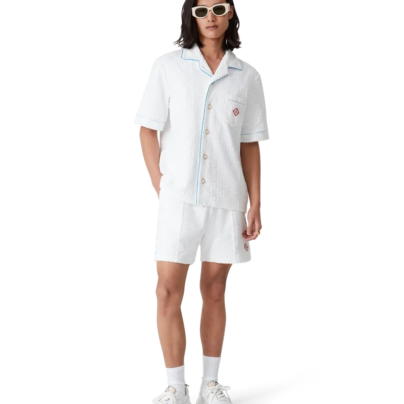 Die Monogram-Frottee-Shorts sind ein klassisches Design aus Monogram-Frottee mit dem Diamant-Logo des Hauses. Sie verfügen über einen elastischen Bund, einen innenliegenden Kordelzug mit goldfarbenen Enden, Biesen an der Vorderseite, eine Gesäßtasche mit Reißverschluss, schräge Seitentaschen sowie Paspeldetails an den Vorder- und Gesäßtaschen sowie an den Seiten.